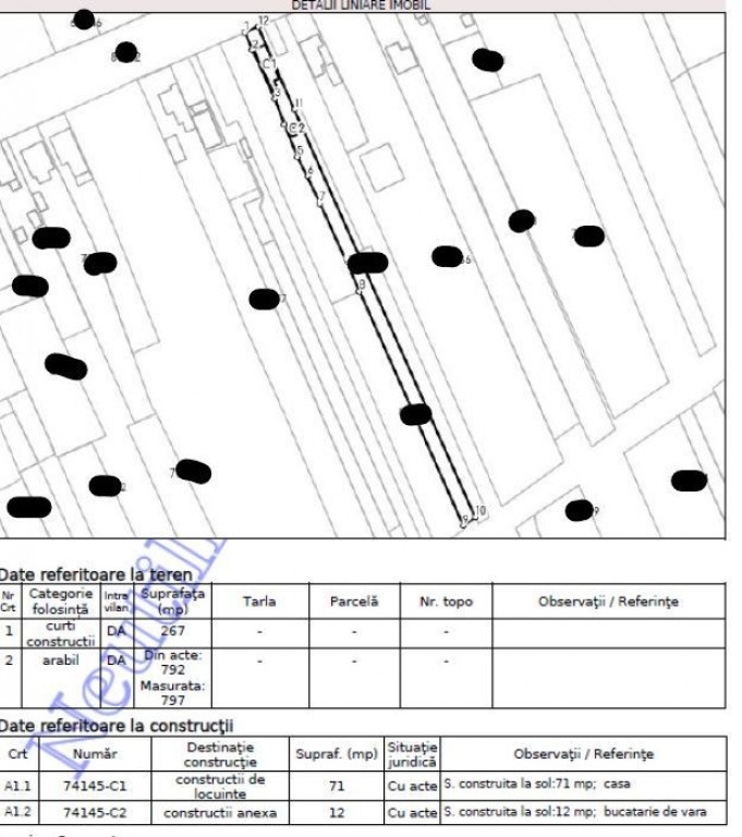 Licitatie publica cota parte din dreptul de proprietate de 1/2 Mun. Bacau, Calea Barladului , Judetul Bacau Suprafata teren 1064 mp Locuinta SC 71 mp Anexa SC 12 mp. Teren intravilan din care categorie de folosinta curti constructii 267 mp, respectiv arabil 797 mp (din masuratori) Vila individuala cu un regim de inaltime P cu o suprafata construita la sol de 71 mp, de o constructie anexa cu o suprafata la sol de12 mp, cu destinatie cu destinatie bucatarie de vara. Planului de amplasament si delimitare a imobilului terenul are o deschidere de circa 5.33 ml la strada Barladului. Acesta are o forma regulata si topografie plana. Terenul este imprejmuit la strada cu gard din scanduri si cu o poarta de acces pietonal si auto din fier forjat. Constructia este reprezentata de o vila individuala cu un regim de inaltime P. Acoperisul este tip sarpanta din lemn cu placi di azbociment. . Tamplarie exterioara din PVC cu geam termopan si pereti exteriori cu tencuilei din ciment. Tip drum de acces: asfaltVecinatati: case/vile, terenuri intravilane Utilitati: energie electrica, gaz, canalizare Anul PIF nu este cunoscut