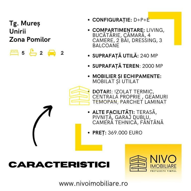 AV/171 Nivo Imobiliare vă propune spre vânzare o casă în Târgu Mureș, cartierul Unirii, zona Pomilor. Casa este dispusă pe 3 niveluri (D+P+E), având o suprafață de 240 mp și este compusă astfel: DEMISOL: pivniță, depozit, cameră tehnică, garaj dublu PARTER: living, bucătărie, cămară, cameră, baie, terasă ETAJ: 3 camere, baie, dressing, 3 balcoane. Terenul aferent are 2000 mp, îngrădit cu acces auto, curte amenajată cu pavaj și cu pomi fructiferi. Construită în 2006, locuința este izolată termic și dotată cu centrală proprie pe gaz și lemn, geamuri termopan și parchet laminat. Se vinde mobilată și utilată la prețul de 369.000 Euro. 0% comision pentru orice imobil cumpărat.