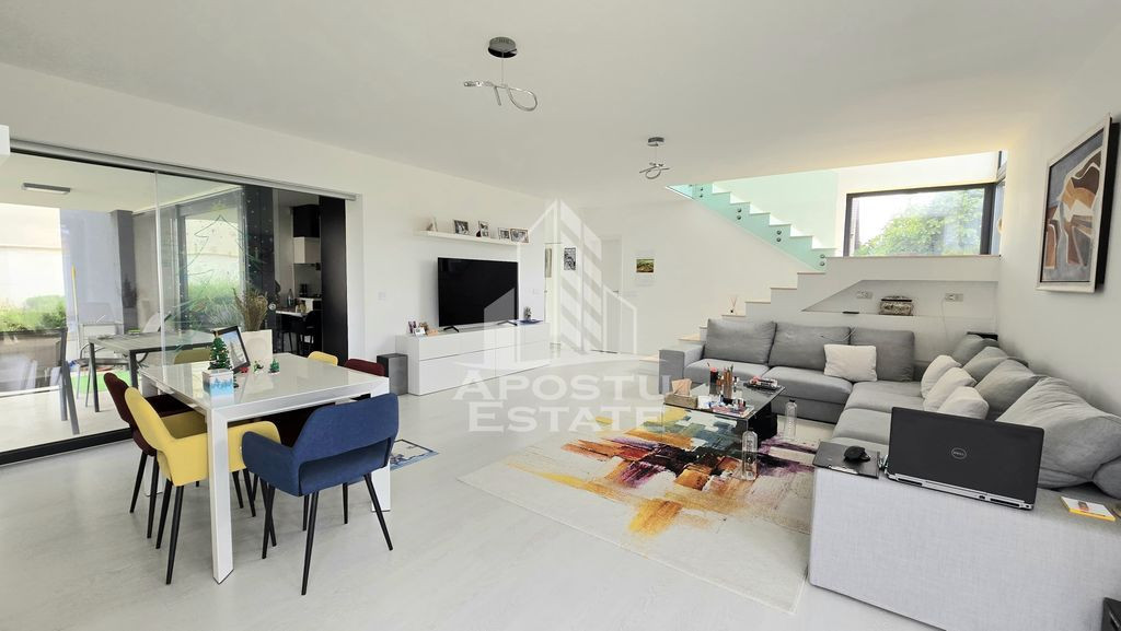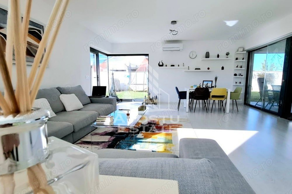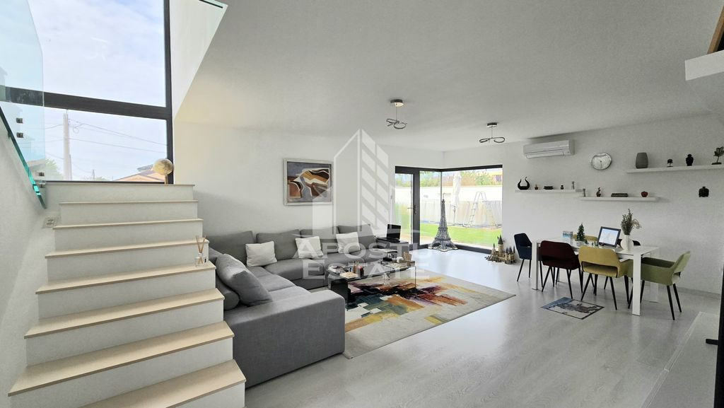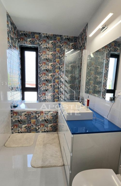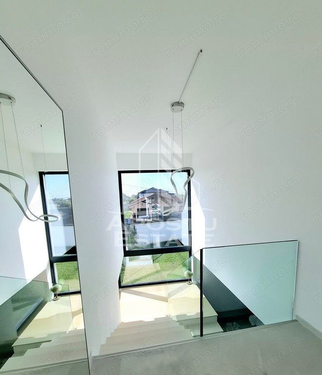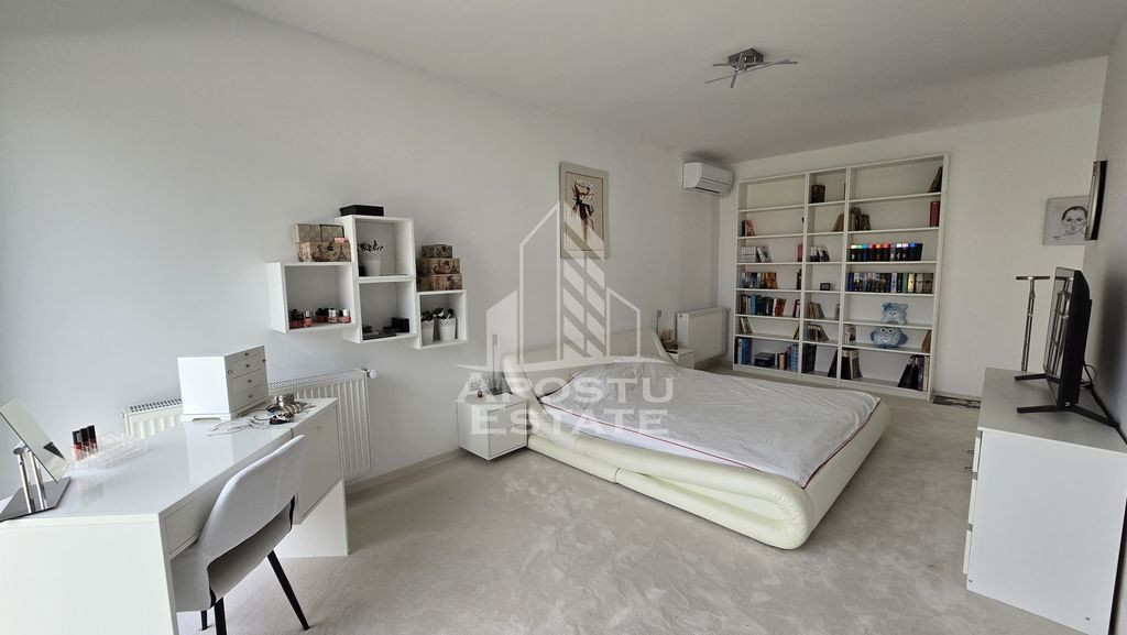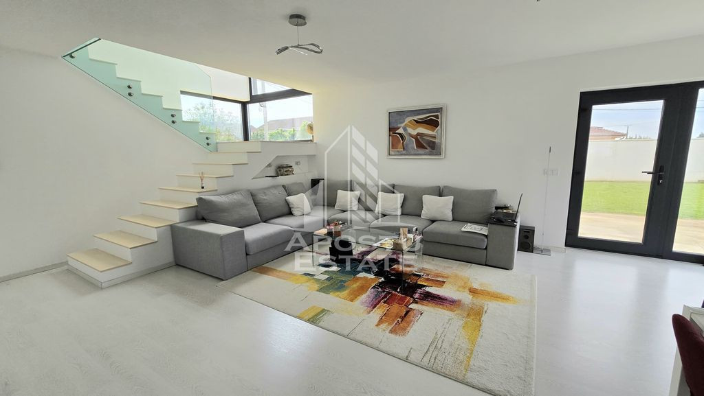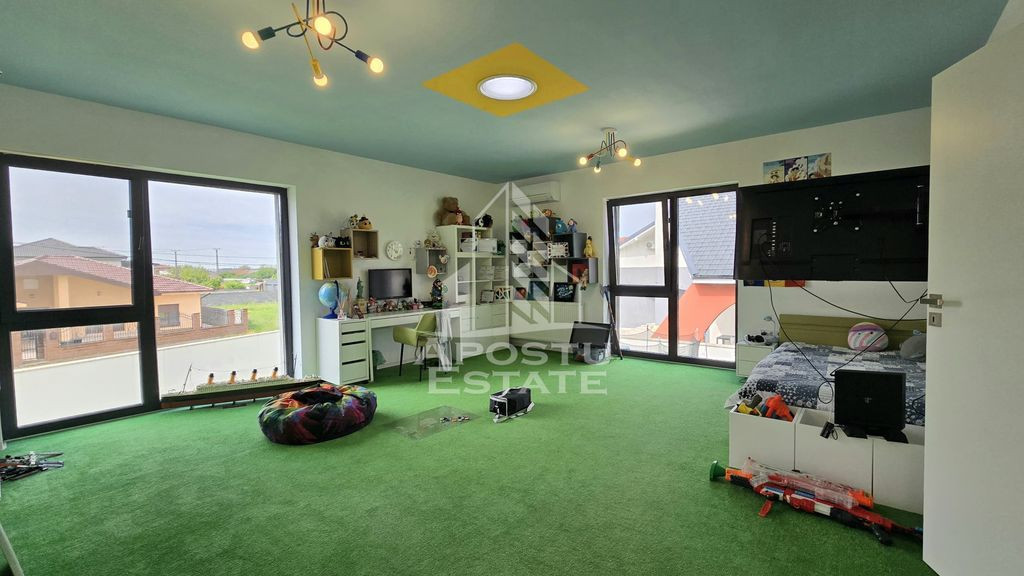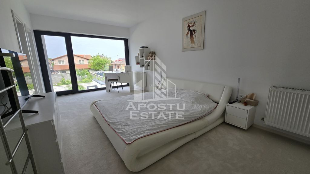 Pentru persoanele care doresc o proprietate intr-adevar unica, cu un aspect deosebit si design modern, luminoasa si la un pas de toate punctele de interes ale zonei. Construita in 2020 pe un teren de 634 mp cu 2 fronturi stradale, si intabulata in octombrie 2021, casa are o suprafata utila de 180 mp, foarte bine impartiti (fara spatii nefunctionale), la care se adauga 2 spatii anexe si anume: - o MAGAZIE (cu acces la apa curenta si electricitate), care se poate transforma usor intr-o bucatarie de vara; si - un BECI cu acces din interior si aerisire naturala (geam). Pentru ca s-au dorit spatii incapatoare si aerisite, aceasta e impartita astfel: Parter: -hol de acces - baie - birou - living luminos cu acces la o terasa neacoperita (de folos in anotimpul rece); - debara - bucatarie cu ieșire la o terasa acoperita (de folos in anotimpul cald); - ETAJ: - HOL incapator; - camera matrimonială , cu baie și dressing propriu -camera copilului cu baie și dressing propriu Confortul termic se realizeaza - in sezonul rece cu ajutorul centralei termice (VIESMANN) legata la un sistem de incalzire prin pardoseala la parter sistem cu calorifere (Purmo) la etaj; - in sezonul cald cu ajutorul celor 3 aparate de aer conditionat (MITSUBISHI) montate - unul la parter si 2 la etaj. La constructia casei calitatea a fost conditia primordiala. Astfel, aceasta beneficiaza de: - termoizolatie exterioara din polistiren de 25 cm (inclusiv fundatia); - invelitoare tip terasa din membrana hidroizolatoare; - tamplarie PVC ALUMINIU Salamander BluEvolution92 cu 2 camere 3 foi de sticla; - parchet special pentru incalzire in pardoseala (Proges); - lemn masiv la scara interioara; - mocheta cu underlay de 10 mm - Raveli; - usi interioare PORTA DOORS; - balustrada din sticla securizata; - Obiecte sanitare cabine de dus: marca GROHE REA ROMSTAL; - Mobilier facut la comanda (INTEGRA DIVANISSIMI) si IKEA; - Electrocasnice MIELE BOSCH exclusiv; Curtea, mare si aerisita, este amenajata cu gazon si alei din beton clasic (pentru ca asa s-a dorit) si piscina supraterana. Exista 2 terase: - una neacoperita pe partea de sud; - una acoperita, pe partea vestica; Gazonul este intretinut cu ajutorul sistemului de irigatie automat, prevazut cu robot si senzor de ploaie, cu dubla alimentare (din foraj sau din reteaua publica). MAGAZIA este complet finisata si amenajata cu blat de lucru, rafturi, spatii de depozitare. Ca si amplasare, locuinta se afla in apropiere de tot ceea ce va intereseaza si va este util in zona: Shopping Mall-ul M CITY se afla la 5 minute de mers pe jos. La fel ca si brutaria, farmaciile, Primaria sau magazinul de bricolaj. Pentru ca toate dotarile si mobilierul au fost special gandite si achizitionate pentru a pune in valoare acest spatiu, vindem casa complet mobilata si utilata. Pretul de vanzare este usor negociabil.