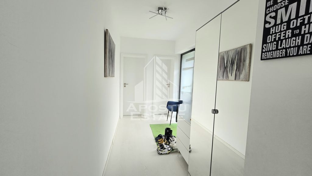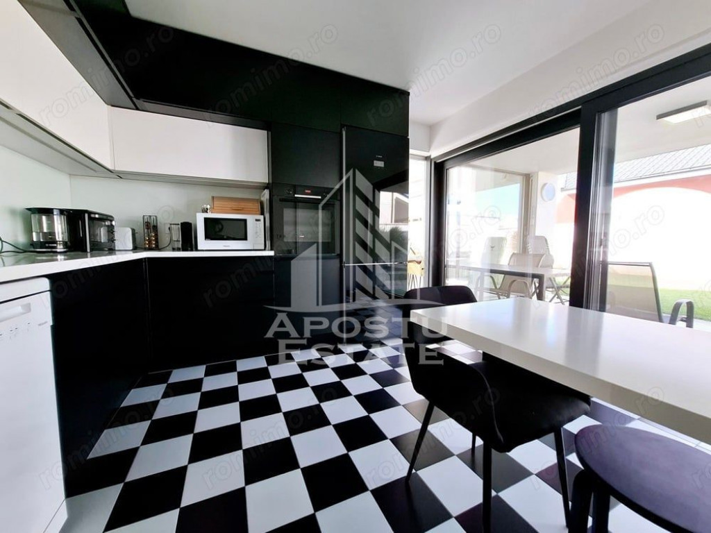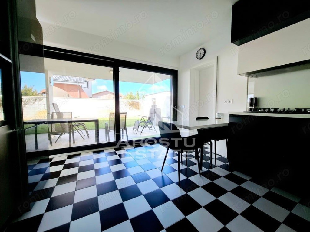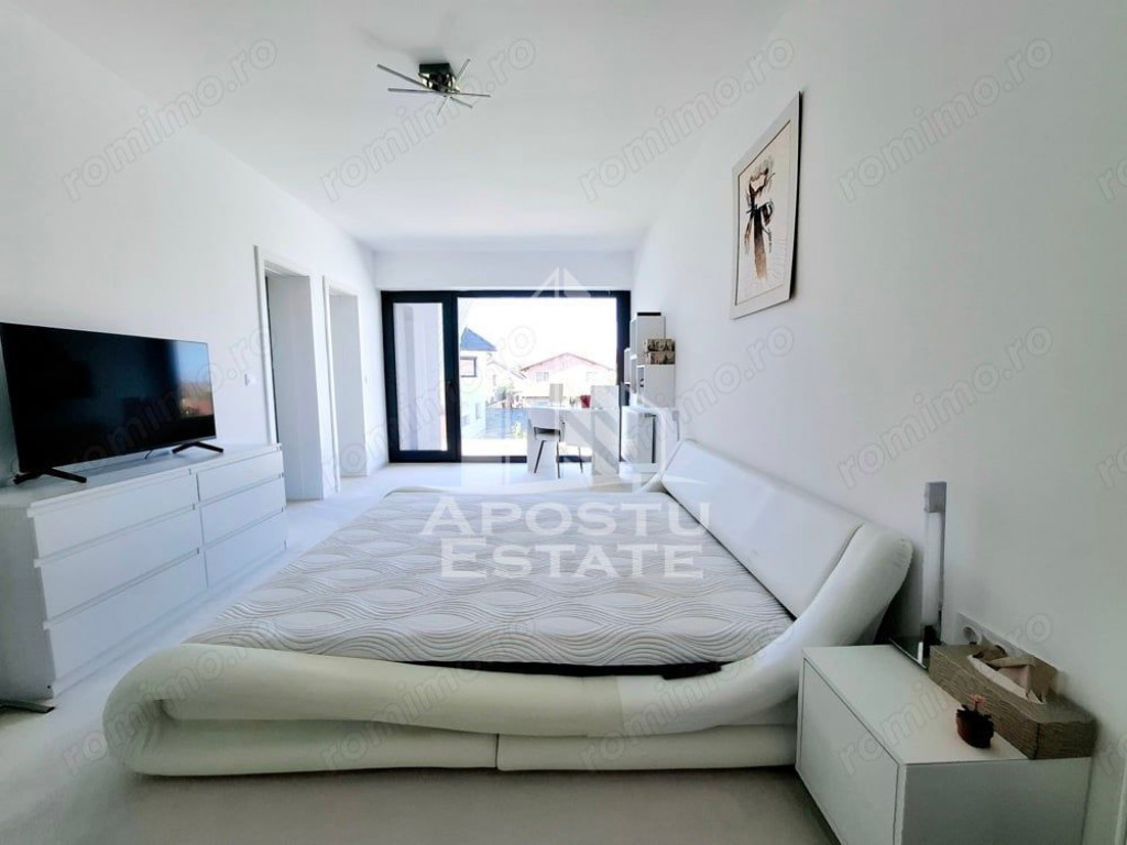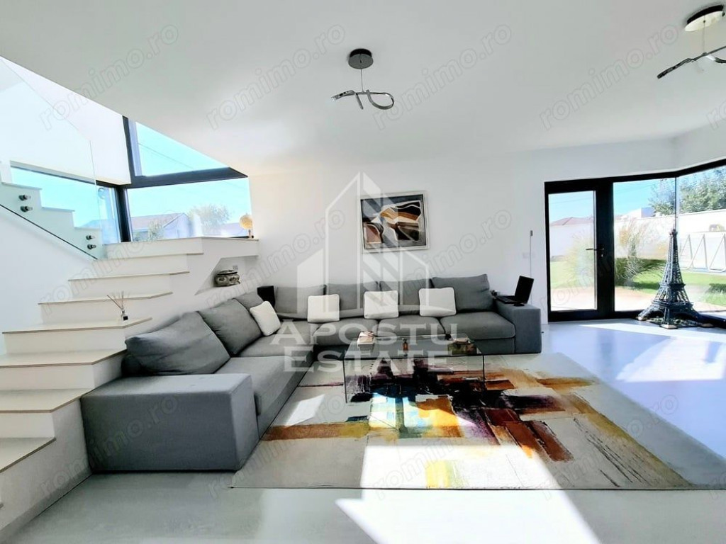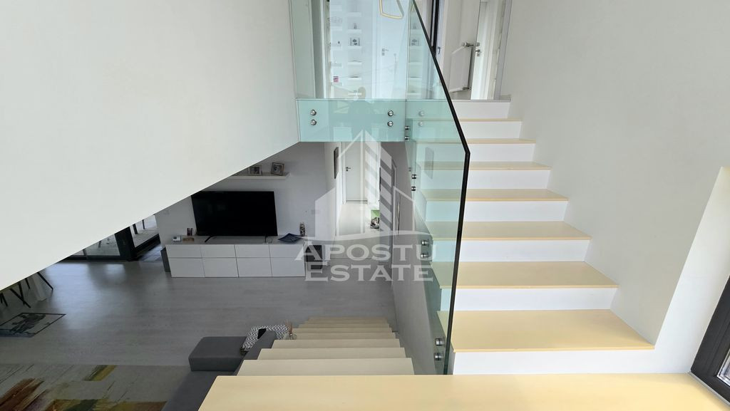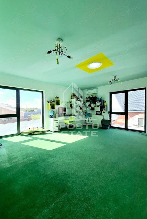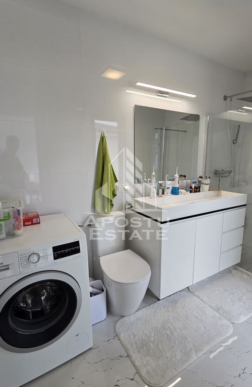 Pentru persoanele care doresc o proprietate intr-adevar unica, cu un aspect deosebit si design modern, luminoasa si la un pas de toate punctele de interes ale zonei. Construita in 2020 pe un teren de 634 mp cu 2 fronturi stradale, si intabulata in octombrie 2021, casa are o suprafata utila de 180 mp, foarte bine impartiti (fara spatii nefunctionale), la care se adauga 2 spatii anexe si anume: - o MAGAZIE (cu acces la apa curenta si electricitate), care se poate transforma usor intr-o bucatarie de vara; si - un BECI cu acces din interior si aerisire naturala (geam). Pentru ca s-au dorit spatii incapatoare si aerisite, aceasta e impartita astfel: Parter: -hol de acces - baie - birou - living luminos cu acces la o terasa neacoperita (de folos in anotimpul rece); - debara - bucatarie cu ieșire la o terasa acoperita (de folos in anotimpul cald); - ETAJ: - HOL incapator; - camera matrimonială , cu baie și dressing propriu -camera copilului cu baie și dressing propriu Confortul termic se realizeaza - in sezonul rece cu ajutorul centralei termice (VIESMANN) legata la un sistem de incalzire prin pardoseala la parter sistem cu calorifere (Purmo) la etaj; - in sezonul cald cu ajutorul celor 3 aparate de aer conditionat (MITSUBISHI) montate - unul la parter si 2 la etaj. La constructia casei calitatea a fost conditia primordiala. Astfel, aceasta beneficiaza de: - termoizolatie exterioara din polistiren de 25 cm (inclusiv fundatia); - invelitoare tip terasa din membrana hidroizolatoare; - tamplarie PVC ALUMINIU Salamander BluEvolution92 cu 2 camere 3 foi de sticla; - parchet special pentru incalzire in pardoseala (Proges); - lemn masiv la scara interioara; - mocheta cu underlay de 10 mm - Raveli; - usi interioare PORTA DOORS; - balustrada din sticla securizata; - Obiecte sanitare cabine de dus: marca GROHE REA ROMSTAL; - Mobilier facut la comanda (INTEGRA DIVANISSIMI) si IKEA; - Electrocasnice MIELE BOSCH exclusiv; Curtea, mare si aerisita, este amenajata cu gazon si alei din beton clasic (pentru ca asa s-a dorit) si piscina supraterana. Exista 2 terase: - una neacoperita pe partea de sud; - una acoperita, pe partea vestica; Gazonul este intretinut cu ajutorul sistemului de irigatie automat, prevazut cu robot si senzor de ploaie, cu dubla alimentare (din foraj sau din reteaua publica). MAGAZIA este complet finisata si amenajata cu blat de lucru, rafturi, spatii de depozitare. Ca si amplasare, locuinta se afla in apropiere de tot ceea ce va intereseaza si va este util in zona: Shopping Mall-ul M CITY se afla la 5 minute de mers pe jos. La fel ca si brutaria, farmaciile, Primaria sau magazinul de bricolaj. Pentru ca toate dotarile si mobilierul au fost special gandite si achizitionate pentru a pune in valoare acest spatiu, vindem casa complet mobilata si utilata. Pretul de vanzare este usor negociabil.