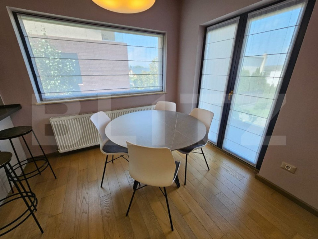 Blitz propune spre inchiriere o casa individuala, situata in zona rezidentiala de case, pe o strada privata. Casa are o suprafata utila de 250 mp si este dispusa pe 3 nivele, D+P+E, fiind compartimentata pe fiecare nivel dupa cum urmeaza: -parter: hol, birou, baie, garaj si debara; -etaj 1: hol, living, terasa, bucatarie cu zona de luat masa, camera, baie si balcon; -etaj 2: 3 dormitoare si 2 bai. Casa este constructie finalizata in anul 2015 care beneficiaza de izolatie termica exterioara si poarta cu deschidere electrica. Este dotata cu centrala termica pe gaz, aer conditionat, usa de intrare si geamurile din termopan cu tamplarie din PVC. A fost renovata complet in 2018, cu finisaje si materiale de cea mai buna calitate. Curtea este amenajata cu gazon si plante ornamentale. Terenul aferent imobilului este de 600 mp. In pretul chiriei sunt incluse si 3 locuri de parcare, dintre care unul in garaj. Casa se preda mobilata si utilata Cod ofertă / ID BLITZ: P3255 Id intern: P3255