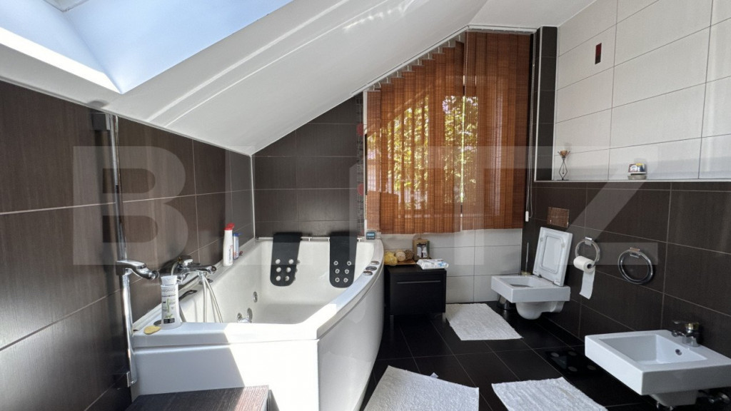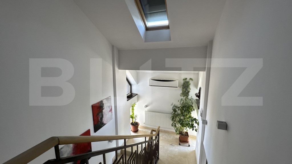 BLITZ îți oferă spre achiziție o proprietate deosebită, care cu siguranță va satisface cele mai exigenta gusturi și nevoi. Curtea de 720 mp te va fermeca: jacuzzi, foișor cu grătar unicat, împreună cu cuptor în bucătăria de vară și gazonul impecabil, plante decorative de la Oltenia Garden, cu zone placate cu travertin, toate te vor face să te simți 'acasă'. Compartimentarea casei se prezintă astfel: - la parter găsim un open space generos, cu living, bucătărie, dining room, birou și o cameră tehnică - etajul, luminat natural de ferestre de mansardă acționate electric, prezintă două master bedrooms, cu garderobă și baie proprii și încă un dormitor spațios, toate având ieșire la terase private. Ca și utilități avem panouri foto-voltaice, centrală electrică, termo - șemineu pe lemne, centrală pe gaz, fosă septică ecologică (este disponibilă și canalizare, dar neracordată), apă curentă și puț forat, curent electric trifazat, sistem de irigare în curte, pachet termoizolant de la Baumit, sistem de alarmă. Se vinde mobilată și utilată, finisajele fiind de lux, alese cu grijă - travertin în toată casa, sisteme smart și multe alte detalii de amenajare și decorațiuni pe care le puteți vedea în poze, dar și mai bine le vom descoperi împreună la vizionare. Te așteptăm să-ti bucuri familia și prietenii de liniște, răcoare vara și o atmsoferă de vis iarna, în jurul termoșemineului din living, precum și clipe minunate în natura din curte, unde se va monta și o psicină. Cod ofertă / ID BLITZ: P8386 Id intern: P8386