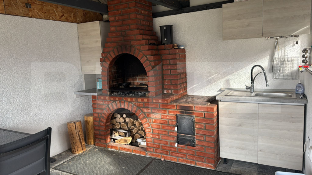 • Foișor din cărămidă cu spatiu de depozitare, dotat cu grătar zidit. Foisorul este inchis cu prelata de terasa, perfect pentru socializare