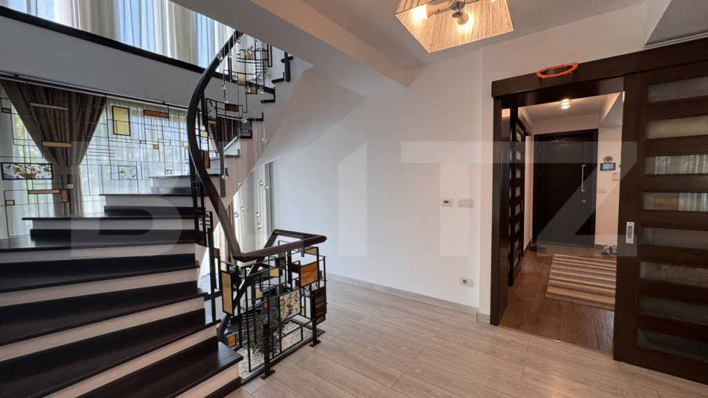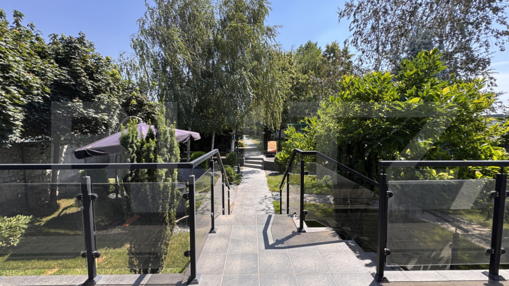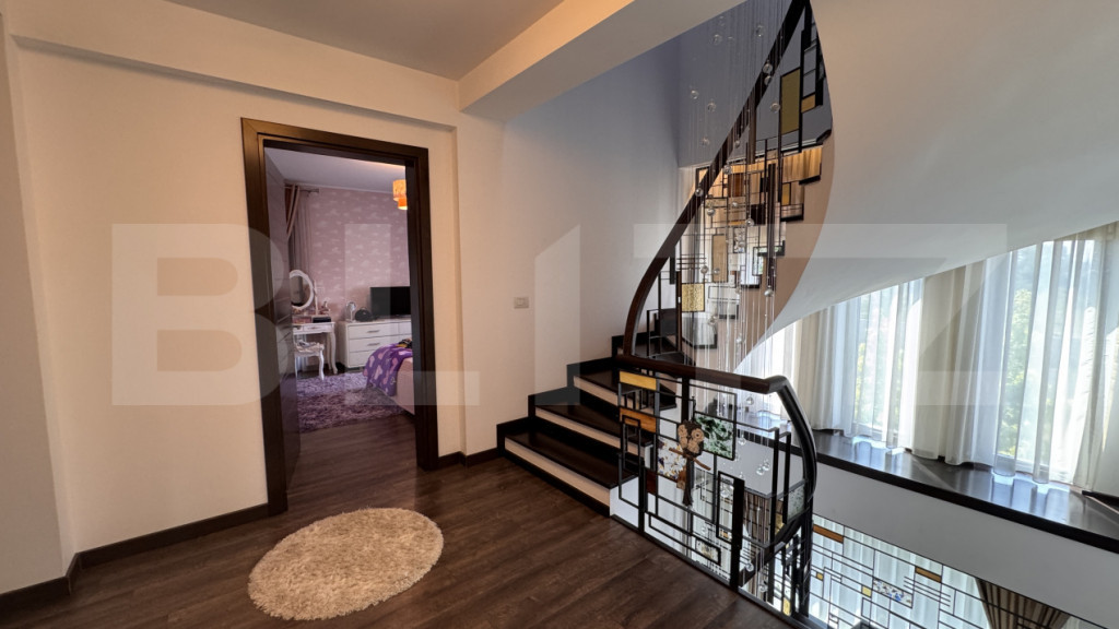 BLITZ propune spre vânzare o casă deosebită, cu regim de înălțime S + P + 2E, o suprafață utilă de 353 mp, ridicată pe un teren de 1.307 mp, din inima cartierului Veteranilor. Casa a fost construită în 2013 din BCA portant și folosind doar materiale de cea mai bună calitate, cu finisaje de top, spații bine gândite și racaordată la toate utilitățile, sistemul de încălzire fiind compus din 2 centrale de 35 kw în condensație pe gaz. Totodată, imobilul beneficiază și de un kit de panouri fotovoltaice care acoperă cea mai mare parte din consumul de energie electrică. Compartimentarea casei este una foarte practică, asigurându-se, totodată, un confort sporit, după cum urmează: - Subsol = garaj cu loc pentru 2 mașini și priză electrică de încărcare, casa scării și hol de unde se acceseaxză un spațiu depozitare/o cămară și camera tehnică - Parter = hol intrare, dressing, baie, bucătărie și un open space generos cu dinning și living, de unde se face trecerea spre curtea din spate a casei printr-o terasă acoperită - Etajul 1 = 3 dormitoare, din care unul matrimonial cu dressing, baie și balcon, o a doua baie și al doilea balcon pentru celelalte 2 dormitoare - Etaj 2 = loc de joacă open space, cu birouri și un dormitor pentru oaspeți, cu acces direct la o baie, ce se poate accesa și dintr-un hol din open space, care mai oferă acces la un dressing; dormitorul are acces și la un balcon cu vedere spre curtea din față, iar birourile la al doilea balcon ce dă spre curtea din spate Un element special al casei, o adevărată piesă arhitecturală unicat, îl reprezintă scara de tip elicoidal, cu mână curentă și trepte îmbrăcate în lemn, balustradă din fier forjat și sticlă colorată, cu candelabru ce coboară de la etajul 2 până la parter; costul acestei scări lucrate și montate manual pe poziție a fost de 40.000 euro. Pe lângă casa deosebită, cel de-al doilea beneficiu principal al acestei proprietăți îl reprezintă curtea mai mult decât generoasă, superb amenajată și foarte bine accesorizată. În partea din față avem poarta automată pentru acces auto situată în fața intrării în garaj, pavele, gazon, tuia, copaci, pietre și plante ornamentale, un mic iaz cu pești, două fântânițe, un coș de baschet, supraveghere video și sistem de iluminat. În partea din spate, pe lângă alte plante, gazon, copaci și o alee pietruită și placată regăsim un foișor ce poate fi folosit tot timpul anului, cu șemineu, sistem audio - video și o zonă de gătit în față super accesorizată ce cuprinde un grătar zidit, unul de tablă și o sobă cu plită, pentru a putea pregăti mese minunate pentru prieteni și familie atât în stil modern, cât și clasic, ca la bunica acasă; tot aici regăsim o căsuță pe post de magazie de unelte, un loc de joacă pentru copii cu spațiu pentru piscină și o zonă de terasă lângă, iar în spate de tot o livadă de pomi fructiferi. Imobilul se accesează ușor și se află într-o zonă mai retrasă bucurându-se de intimitate și puțini vecini. Apropierea de parcul Romanescu și poziția într-unul din cele mai căutate și dezvoltate cartiere din Craiova, calitatea construcției mobilată și utilată complert și modern, finisajele premium, curtea mai mult decât generoasă, superb amenajată și întreținută, împreună cu zonele de relaxare bine gândite și accesorizate sunt tot atâtea motive pentru a înțelege că suntem în fața unei proprietăți cu adevărat deosebite. Totul a fost realizat pentru confortul personal, nu pentru vânzare, vă aștept cu drag la vizionare pentru a vă convinge. Imobilul este deținut de o firmă drept urmare la prețul afișat se adaugă TVA. Cod ofertă / ID BLITZ: P150780 Id intern: P150780