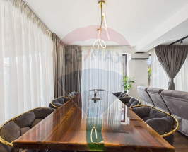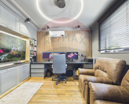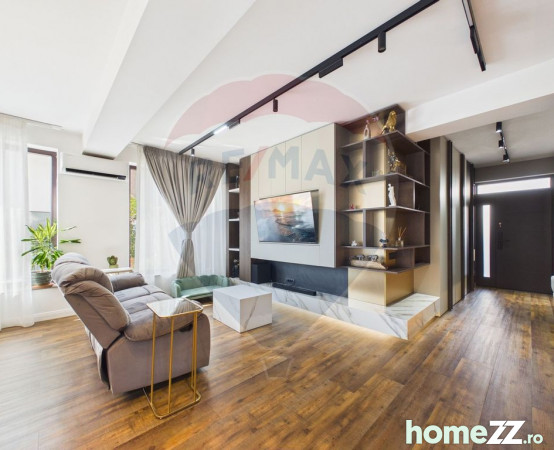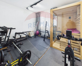 Interiorul este amenajat în stil contemporan, cu living generos și zonă de dining, 2 dormitoare, birou, cameră dedicată sală de fitness și saună, dressing-uri multiple și mobilier realizat pe comandă. Finisaje premium: lavabilă decorativă 3D, iluminat LED și proiectoare încastrate, uși filomuro, parchet triplu stratificat herringbone la etaj și SPC rezistent la apă la parter.
