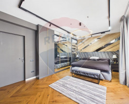 Etaj – dormitor matrimonial cu baie proprie, dressing și balcon, cameră fitness/saună, cameră dressing, baie cu cadă freestanding, acces către pod înalt mansardabil.