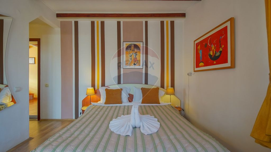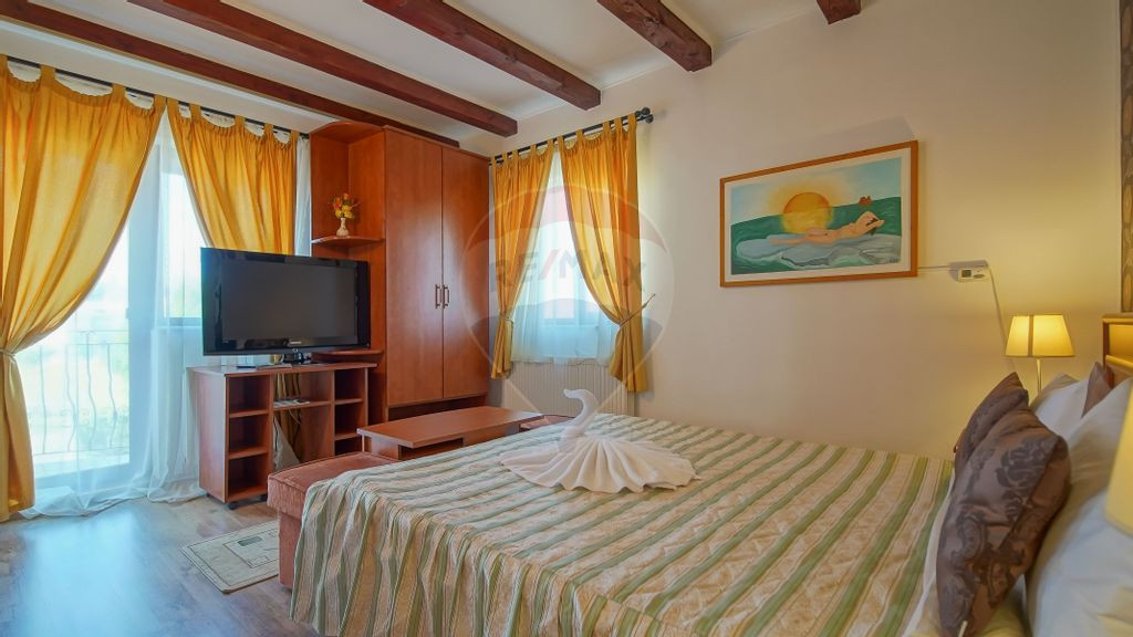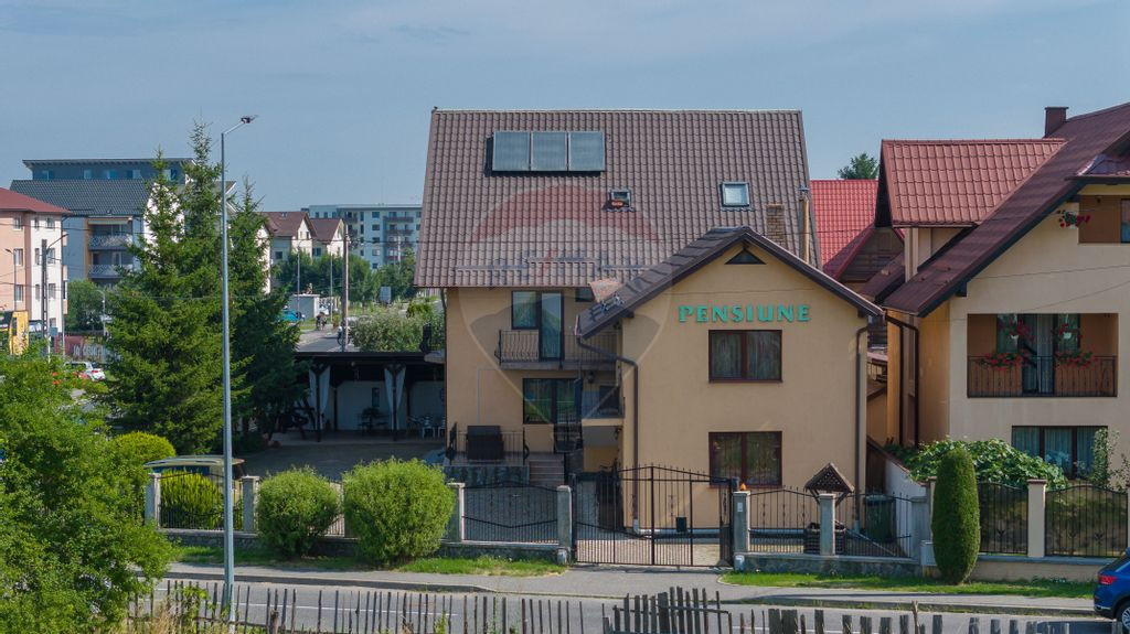 Pensiune de Vânzare - Râșnov, Brașov – Oportunitate de afacere! Vă propunem spre vânzare o pensiune activă, clasificată 3 stele, situată central, cu acces direct la drumul principal care străbate localitatea (DN73). Caracteristici: - 14 camere (2 apartamente, 8 camere duble și 2 triple) - 13 băi - Recepție, living și un loc generos de luat masa - Teren 715 mp, curte generoasă - 12 locuri de parcare - Terasă acoperită - Panouri solare pentru apă caldă - 2 centrale termice (gaz și lemn), șemineu Se vinde complet utilată și mobilată, gata de a continua activitatea. Râșnovul este o loalitate dinamică, în plină dezvoltare, cu numeroase atracții și evenimente desfășurate pe toată perioada anului. Dintre atrcții enumerăm: Cetatea Râșnov, Dino Parc, Peștera Valea Cetății, Cheile Râșnoavei... Aici, sunteți la doar câteva minute de Brașov, Poiana Brașov, Bran și la 3 ore de București. Pensiunea este ideală pentru preluarea afacerii, având clienți fideli și un flux turistic constant! Nu ratați ocazia de a investi într-o locație cu potențial real de creștere!