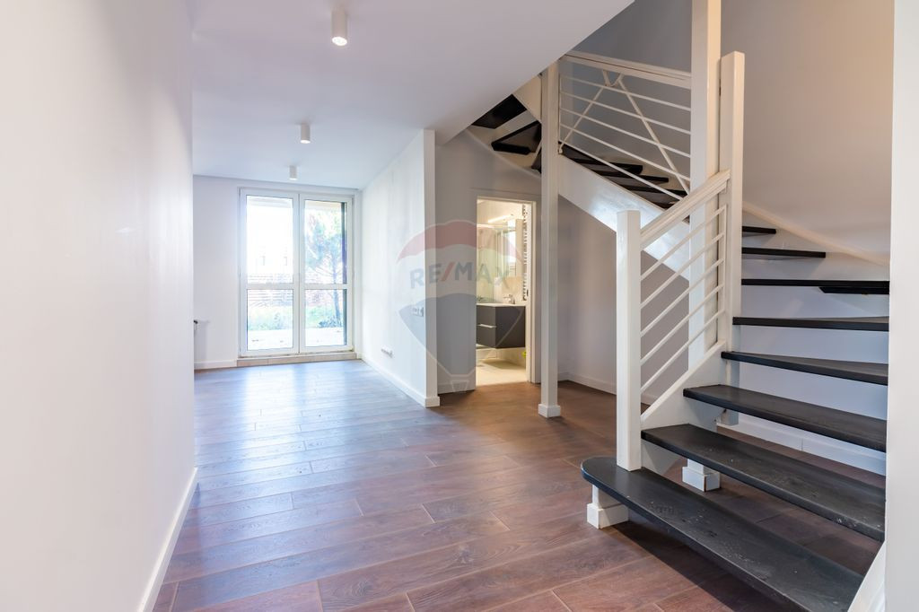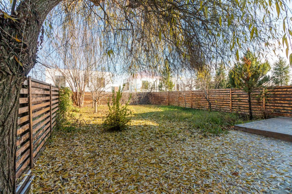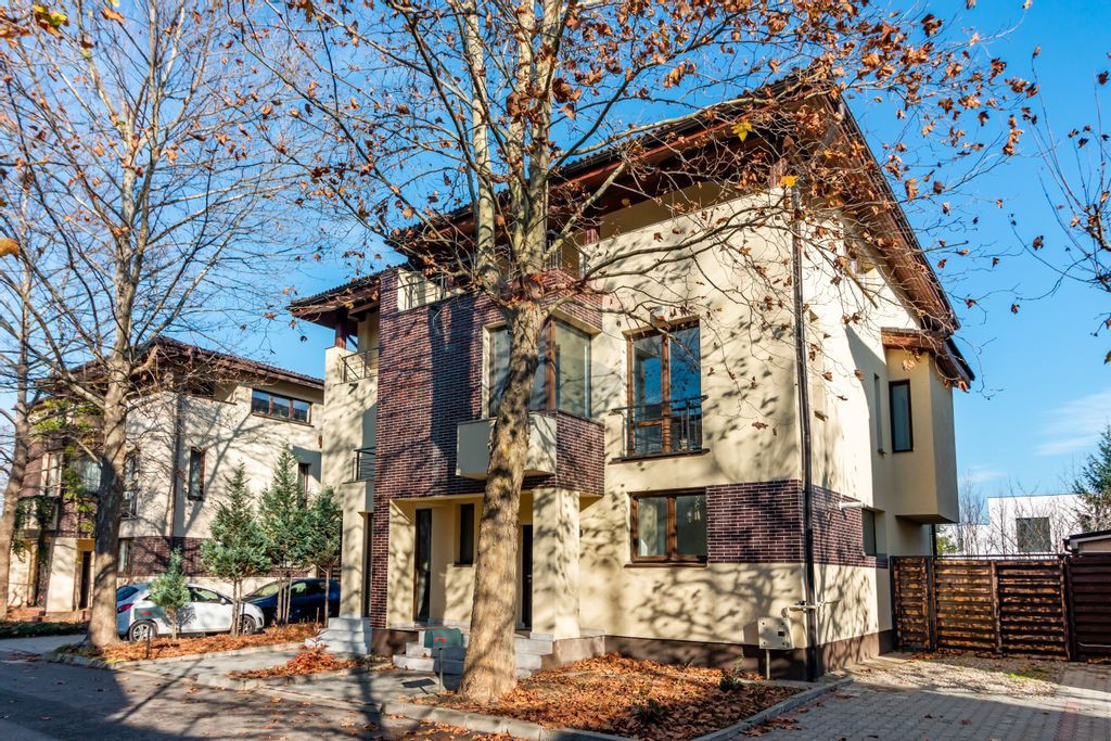 Casa de vanzare in Corbeanca. Proprietatea se afla pe o strada formata doar din case, intr-un ansamblu rezidential, cu paza permanenta si acces cu bariera. Duplexul este format din camere spatioase si este compartimentat astfel: la parter se afla livingul, bucataria si zona de dinning, o baie, hol, casa scarii si camera tehnica. Accesul catre terasa de 24 mp si gradina se face prin living. Etajul 1 este format din trei dormitoare, dintre care unul, cel matrimonial, cu baie si dressing proprii. Pe hol se mai afla inca o baie pentru celelalte doua dormitoare. Dormitoarele au balcone. Mansarda este open space, cu acces spre cele doua terase inchise, fiecare avand 29 mp. Proprietatea are doua locuri de parcare. Centrala functioneaza pe gaz, Ariston, de 35kw. Strada asfaltata, toate utilitatile disponibile. Scoli, gradinite si supermarket in apropiere, lac si padure in imediata vecinatate, centrul comunei, cu magazine si restaurante la doar 2 minute distanta de mers cu masina. Avem disponibile doua unitati locative de acest fel.