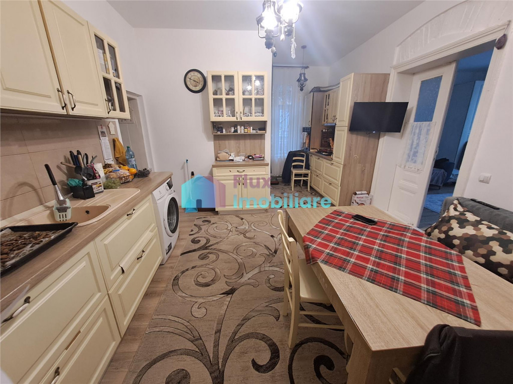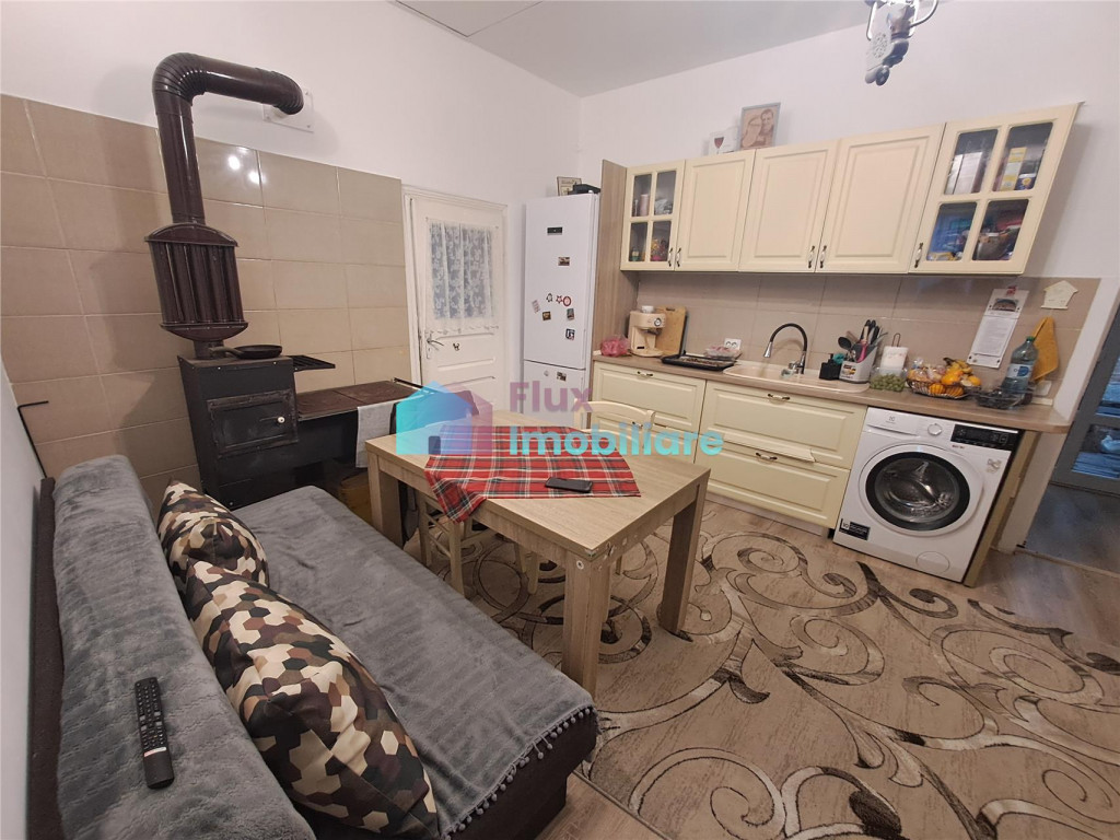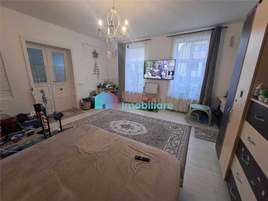 Flux Imobiliare va ofera spre vanzare o casa situata in zona centrala a orasului, cu acces facil spre institutii, banci, magazine, scoli sau gradinite. Suprafata totala a casei este de 133 mp, iar suprafata utila de 110 mp, fiind compartimentata astfel: living, bucatarie loc de servit masa, 2 dormitoare, 3 bai (doar 2 sunt finisate) si hol. Are pod mansardabil, cu suprafata de aproximativ 90 mp si beci de 7,5 mp. Locuinta dispune de suprafata de 286 mp teren, aflat in proprietatea primariei, proprietarul avand contract de inchiriere valabil pana in decembrie 2026. Imobilul este construit din caramida (grosime zid 60-70 cm) izolatie de 5 cm, are acoperis din tabla, tamplarie din pvc cu geam termopan, usi interioare din lemn, gresie faianta, parchet, instalatie electrica din cupru, instalatie sanitara refacuta total, sape. Incalzire cu centrala termica pe gaz semineu pe lemne sobe de teracota functionale. Casa are 2 intrari separate, permitand astfel obtinerea a doua locuinte individuale (un apartament cu 2 camere si o garsoniera). Se vinde mobilata si utilata complet la pretul de 250.000 euro negociabil la fata locului. Datorita pozitionarii, casa este pretabila si pentru sediu de firma, cabinet medical, cabinet de avocat sau afterschool.