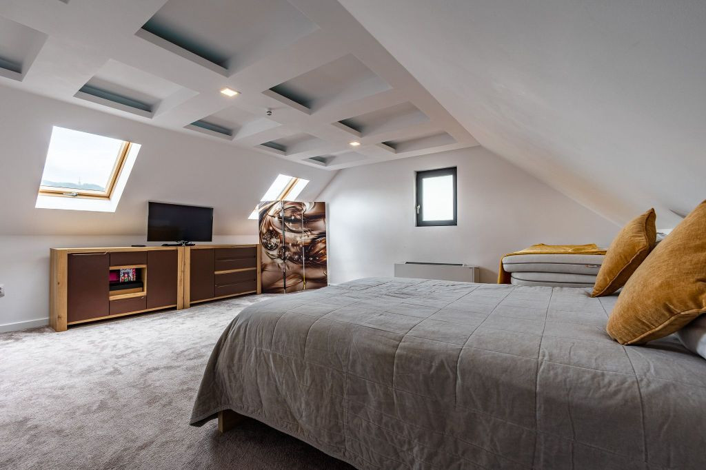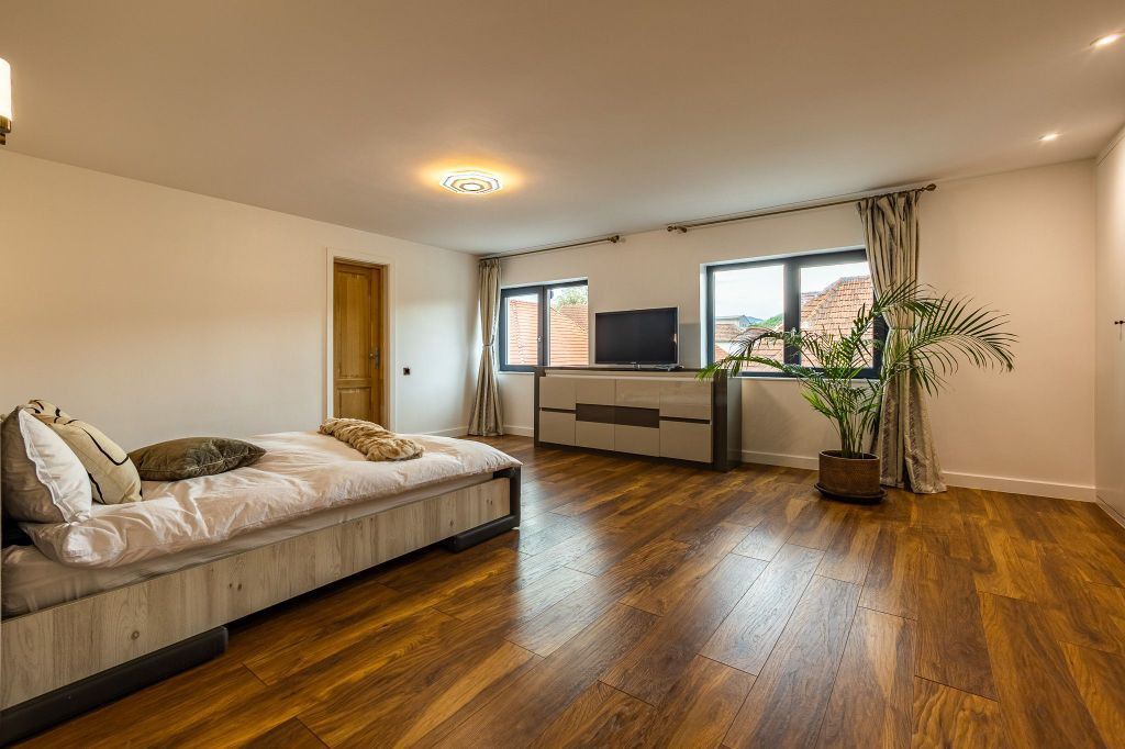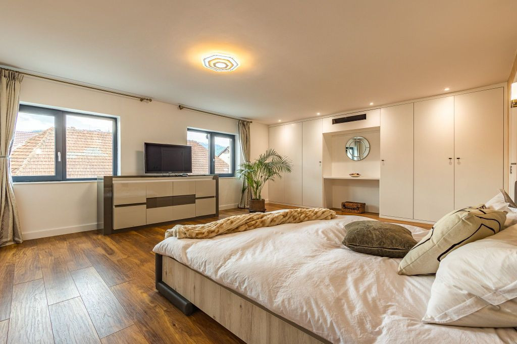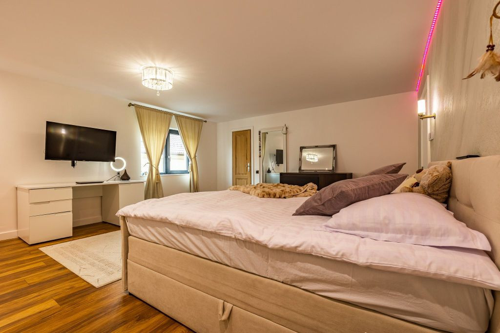 Vânzare casă pasivă în Brașov Comision cumparator: 0% Suntem încântați să vă prezentăm o proprietate excepțională situată în Brașov, pe strada Călugăreni. Această casă pasivă finalizată în anul 2023 vă oferă un stil de viață confortabil. Iată mai multe detalii despre această locuință deosebită: Caracteristici ale casei: Suprafață utilă: 467 mp Configurație: S+P+E+M Parter: ,Living spațios de 31 mp, bucătărie de 30 mp și baie + un apartament cu 3 camere cu inntrare separata, ideal pentru regim hotelier. Etaj: 4 dormitoare matrimoniale cu băi proprii, cu suprafețe cuprinse între 25 și 35 mp. Mansardă: Un open space superb de 103 mp cu ferestre Velux și vedere spre Tâmpa, plus un dormitor matrimonial și o baie. Sistem energetic: Încălzire și răcire: Echipat cu o pompă de căldură Samsung DVM S Eco de 32 kW pentru încălzire și 28 kW pentru răcire, cu un coeficient de performanță (COP) de 5.11. De asemenea, este instalat un boiler Austria Email HT400 ERMR, un rezervor de apă racită ELBI AR300 și o stație de dedurizare STP 30 cu vana Clark. Eficiență energetică: Dispune de un sistem cu 30 de panouri fotovoltaice de 12 kW, o centrală termică Immergas Tera 35 ERP și un invertor hibrid de 10 kW Fronius Symo. Încălzire și răcire la toate etajele: Sistemul de încălzire este realizat prin pardoseală cu termostate individuale, iar răcirea se face prin ventiloconvectoare. Mobilier și dotări: Proprietatea se vinde complet mobilată și utilată. Mobilierul este confecționat din MDF și a fost realizat pe comandă, garantând calitate și design personalizat. Această casă pasivă oferă nu doar un stil de viață modern și confortabil, dar și o eficiență energetică remarcabilă. Cu detalii impecabile și finisaje deosebite, această proprietate este pregătită să devină noul cămin al unei familii exigente. Pentru mai multe informatii sunati la numarul de telefon din anunt.