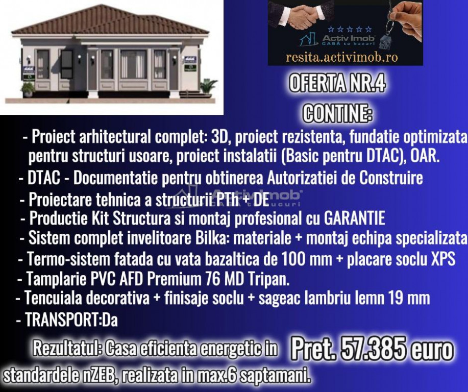 Beneficii pentru clientii acestei oferte: Comision ZERO%! Consultanta gratuita pentru constructia casei tale! Transport gratuit oriunde in Romania! Garantie si mentenanta pentru 15 ani! Livrare in maxim 6 saptamani! Construieste locuinte moderne, eficiente energetic si accesibile! Agentia Imobiliara Activ Imob Lugoj este mandra sa va acorde consultanta, alaturi de partenerii nostri de incredere, pentru productia si montajul constructiilor inovatoare pe structura de lemn si panouri SIP, oferind solutii moderne si sustenabile pentru viitorul locuintelor. Toate serviciile de consultanta si intermediere sunt oferite GRATUIT in vederea construirii de case, cabane, hale, etc. atat clientilor Activ Imob Lugoj cat si noilor clienti care doresc imobile construite in maxim 6 saptamani, avand costuri reduse fata de orice alt material de constructie de pe piata si cel mai mare grad de eficienta energetica, dupa cum urmeaza: Oferta nr. 1 ndash; 12.650 euro; (detalii in fotografii) Oferta nr. 2 ndash; 18.400 euro; (detalii in fotografii) Oferta nr. 3 ndash; 31.050 euro; (detalii in fotografii) Oferta nr. 4 ndash; 57.385 euro; (detalii in fotografii) Toate ofertele sunt calculate pentru o suprafata construita de 115 mp., iar preturile includ TVA si transport gratuit in Romania. Pentru livrari in Europa, costul transportului se stabileste de comun acord. Detalii importante: Fundatia nu este inclusa in oferta, aceasta fiind responsabilitatea proprietarului. Terenul nu este inclus in oferta, fiind responsabilitatea exclusiva a clientului. Pentru informatii suplimentare despre pasii necesari pana la finalizarea casei, ne puteti contacta telefonic sau completand formularul de mai jos. Un consultant va va oferi toate detaliile necesare. Compania Nationala Activ Imob Romania detine exclusiv dreptul de consultanta si intermediere prin brokerii sai imobiliari din judetul Timis pentru aceste oferte, garantand astfel corectitudinea informatiilor furnizate si siguranta intregului proces de achizitie. Va multumim ca ati ales siguranta si profesionalismul! Mai multe fotografii si detalii pe site-ul nostru: resita.activimob.ro. Broker Imobiliar Mioara Lenghen, 0772 204 259. Oferim consultanta gratuita pentru credite ipotecare si refinantare! ID ACTIV IMOB: 225931 CASA te bucuri!!!