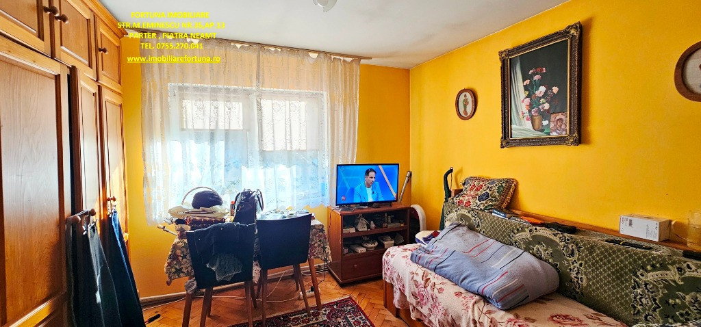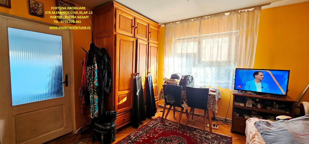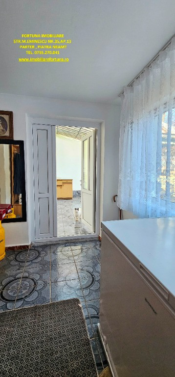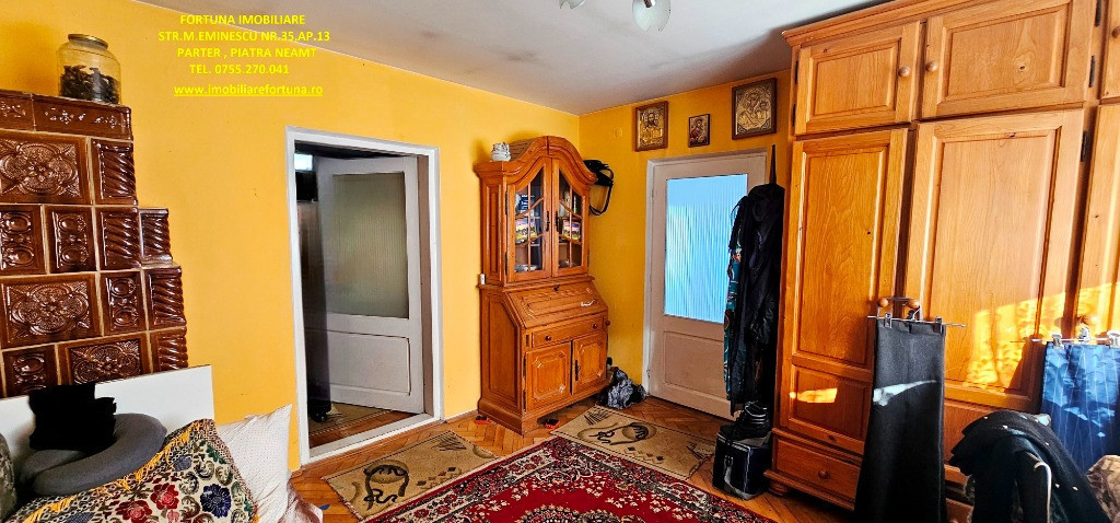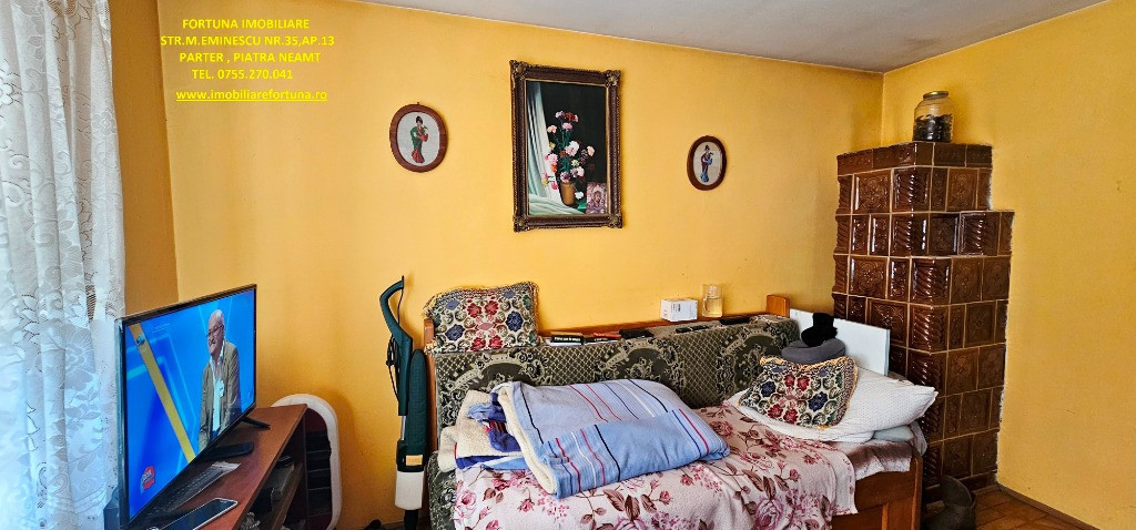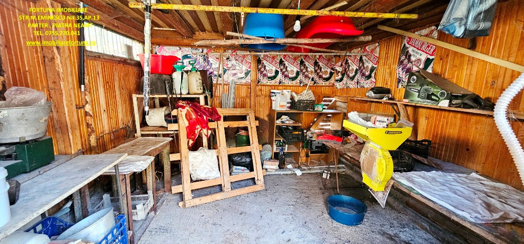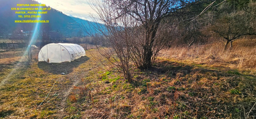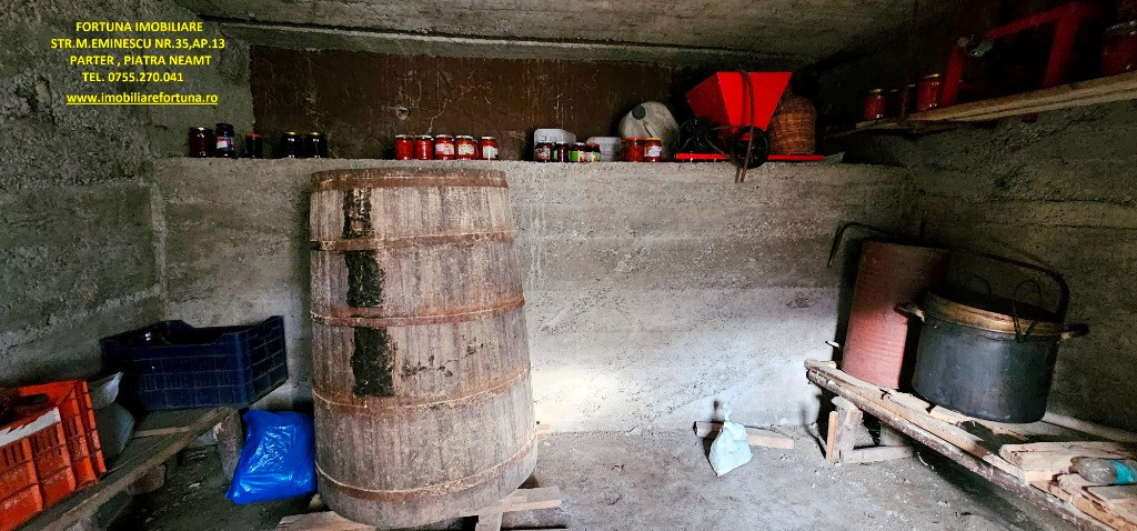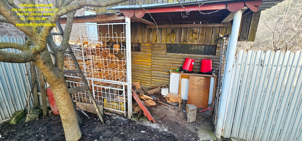 CASĂ + ANEXĂ + TEREN 6.000 MP, LA 10 MINUTE DE ORAȘ, ÎN CADRU NATURAL DE VIS, COM. GÂRCINA, 50.000 EURO UȘOR NEG Dacă îți dorești să scapi de stresul și stilul de viață agitat din mediul urban, să fii înconjurat de natură și să dai o șansă traiului liniștit, lipsit de grijile cotidiene, FORTUNA IMOBILIARE propune spre achiziție această proprietate, compusă din suprafața de 6.000 mp teren intravilan, casă bătrânească locuibilă și diverse anexe gospodărești, situată în intravilanul comunei Gârcina din județul Neamț. Casa în suprafață de 74 mp, compusă din terasă acoperită, hol, 2 camere, bucătărie și baie, este construită din cărămidă și chirpici, pe fundații din beton, acoperită cu tablă. Una dintre anexe, cu suprafața de 64 mp - o căsuță bătrânească construită din paianta, pe fundații din piatră - este compusă din 2 camere și bucătărie, iar o altă construcție (în suprafață de 39 mp) poate fi folosită ca spațiu pentru depozitarea sculelor și uneltelor gospodărești și pentru creșterea păsărilor și animăluțelor. Casa este conectată la rețeaua publică de electricitate și apă, iar încălzirea se face prin intermediul unor sobe din teracotă. Terenul are o suprafață plană, este fertil, permițând cultivarea unei varietăți de produse agricole, pomicole și viticole. Imobilul este situat între case, iar partea din spate a terenului fuzionează cu pădurea. Preț 50.000 euro Pentru o prezentare detaliată a acestui imobil, oferirea unor informații suplimentare și programarea unei vizionări, vă invităm la sediul nostru: Fortuna Imobiliare, situat pe str. M. Eminescu, nr. 35, ap. 13, parter, lângă fostul Tribunal, tel. contact 0755.270.041. Your comfort is our priority ! Oferta noastră completă o găsiți aici: https://imobiliarefortuna.ro/