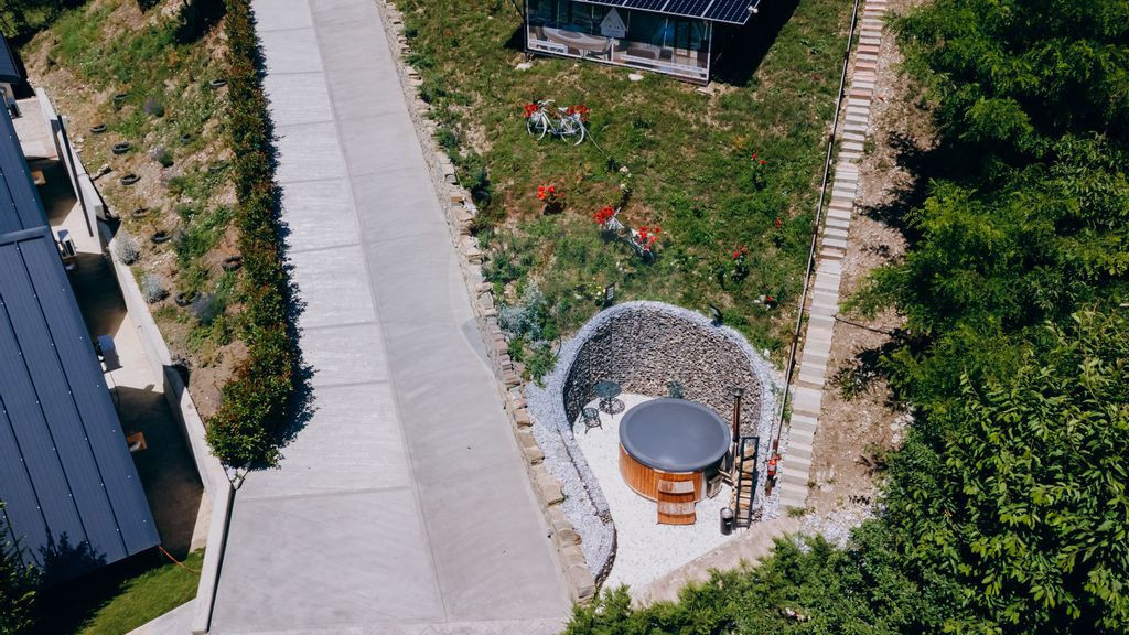 -Cadă cu hidromasaj, poziționată strategic pentru a oferi o priveliște superbă asupra lacului