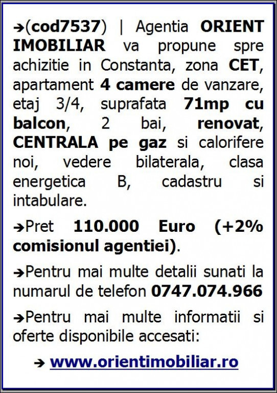 (cod7537) | Agentia ORIENT IMOBILIAR va propune spre achizitie in Constanta, zona CET, apartament 4 camere de vanzare, etaj 3/4, suprafata 71mp cu balcon, 2 bai, renovat, CENTRALA pe gaz si calorifere noi, vedere bilaterala, clasa energetica B, cadastru si intabulare. Pret 110.000 Euro (+2% comisionul agentiei). Pentru mai multe detalii sunati la numarul de telefon 0747.074.966.