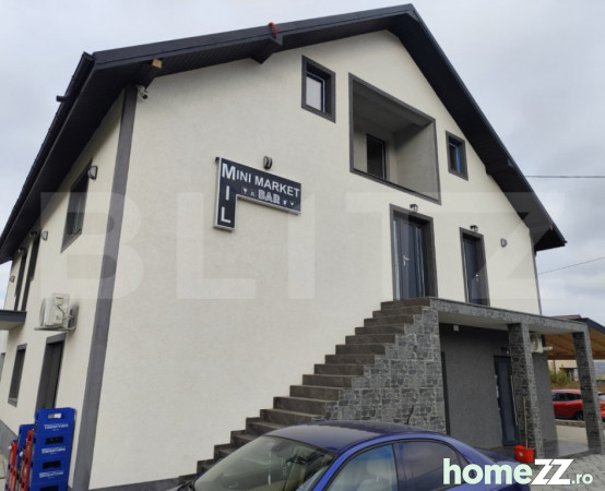 Parter: magazin si bar, ambele functionale, complet echipate si utilate, 3 bai, vestiar pentru personal, camera tehnica , magazie, terasa 60 mp lateral, 60 mp in spate si parcare 140 mp;