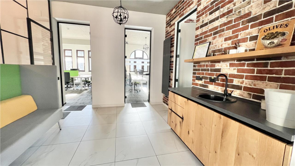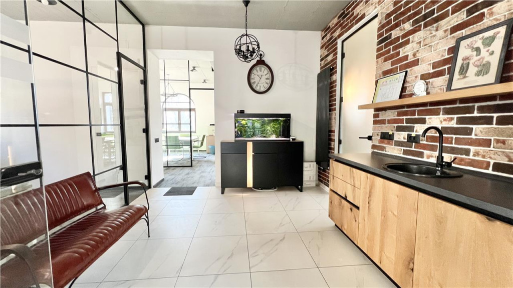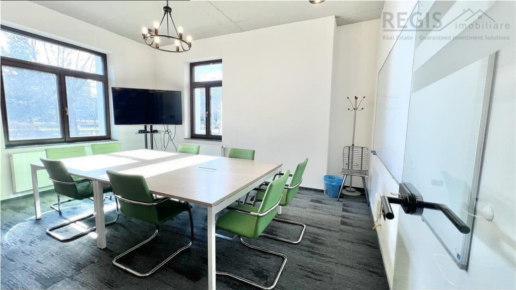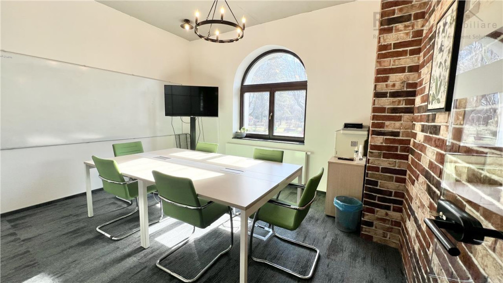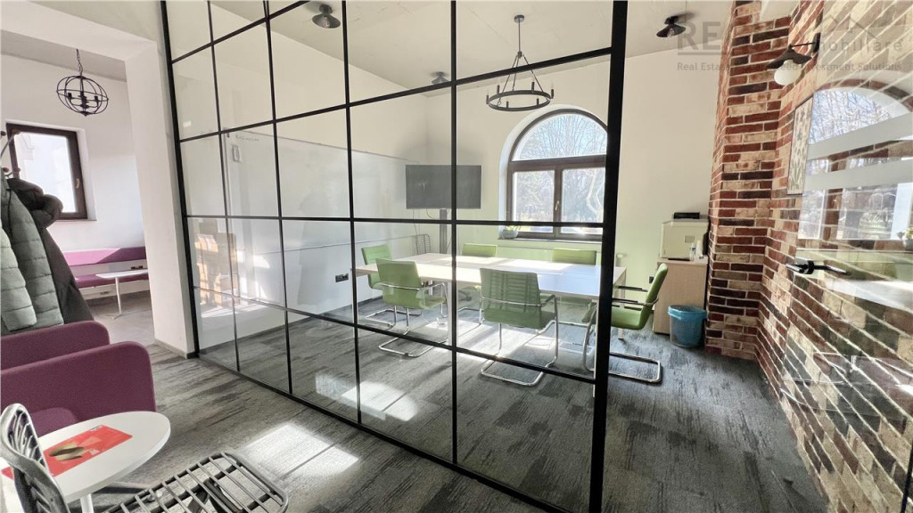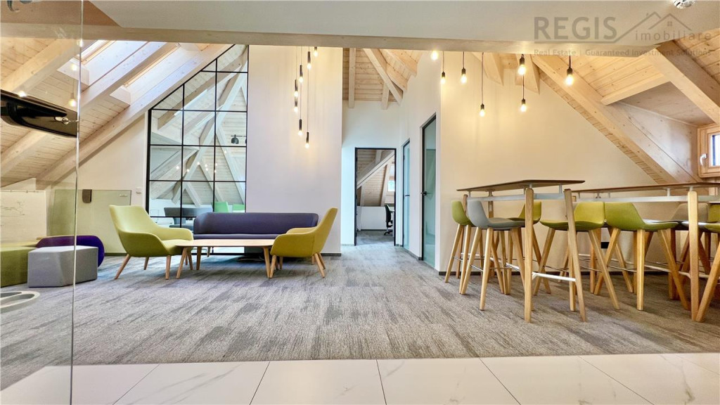 Imbinarea armonioasa dintre elementele clasice ndash; lemn masiv, parchet, tencuieli decorative ndash; si accentele contemporane precum pereti din sticla, mocheta de trafic intens si dotari tehnice moderne, creeaza un ambient profesional distinct si un cadru de lucru la standarde ridicate.
