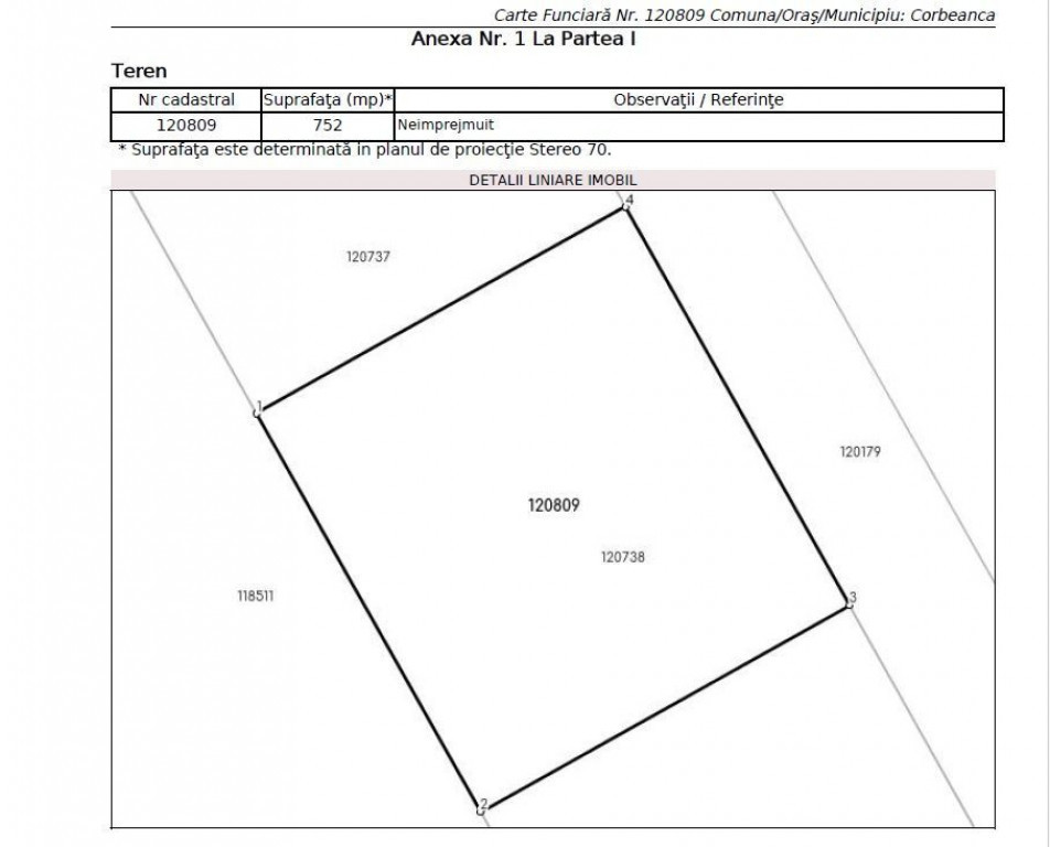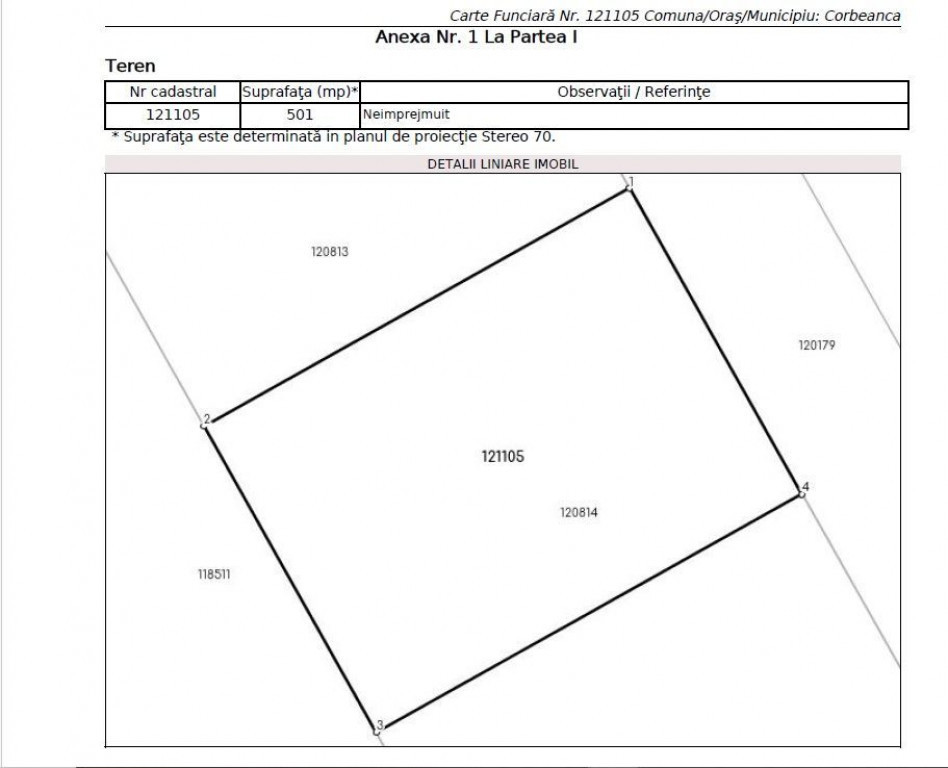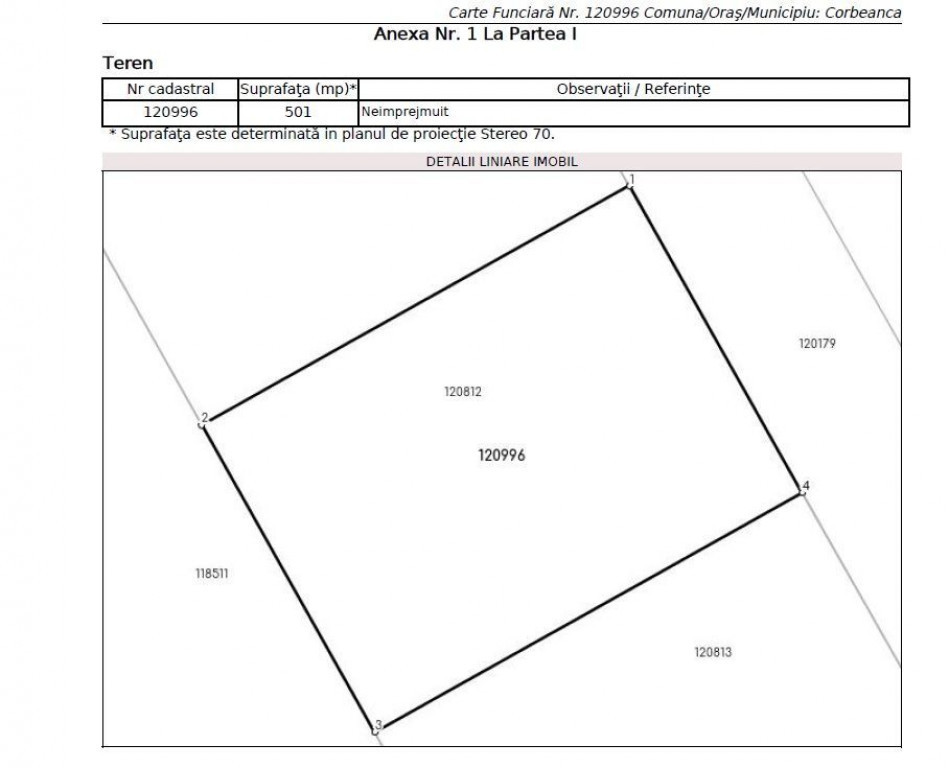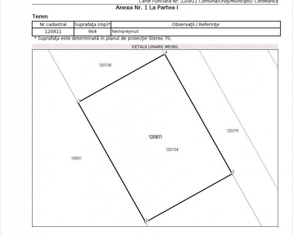 Parcelare rezidențială – Corbeanca | 11 loturi | Zonă Dezvoltată Oportunitate excelentă de investiție sau construire locuință individuală în Corbeanca, într-o zonă rezidențială deja formată, între case, în imediata vecinătate a noului sediu al Primăriei Corbeanca. Teren cu suprafață totală de 9.500 mp, dezmembrat în 11 loturi cu suprafețe cuprinse între 500 mp și 965 mp, fiecare lot beneficiind suplimentar de aproximativ 200 mp cotă indiviză din drumul de servitute. Prețuri începând de la 70 €/mp + TVA, în funcție de suprafață și poziționarea lotului. Avantaje principale: • Stradă principală asfaltată • Toate utilitățile disponibile la limita proprietății • Parcelare organizată, ideală pentru construcții individuale • Zonă locuită, cu vecinătăți construite • Acces rapid către Autostrada A0 • Aproape de noua Primărie Corbeanca • În proximitatea noului liceu • Loc de joacă pentru copii în apropiere • Facilități în zonă: Therme București, centre comerciale, supermarketuri, cafenele și restaurante Loturile sunt potrivite atât pentru familii care doresc să construiască o casă într-o zonă liniștită, cât și pentru investitori interesați de dezvoltare rezidențială. Zona oferă echilibru între intimitate, infrastructură modernă și acces rapid către București. Pentru detalii suplimentare privind disponibilitatea loturilor și preț, vă stăm la dispoziție. IN SUPRAFATA ESTE INCLUSA SI COTA DE DRUM DE 200 MP