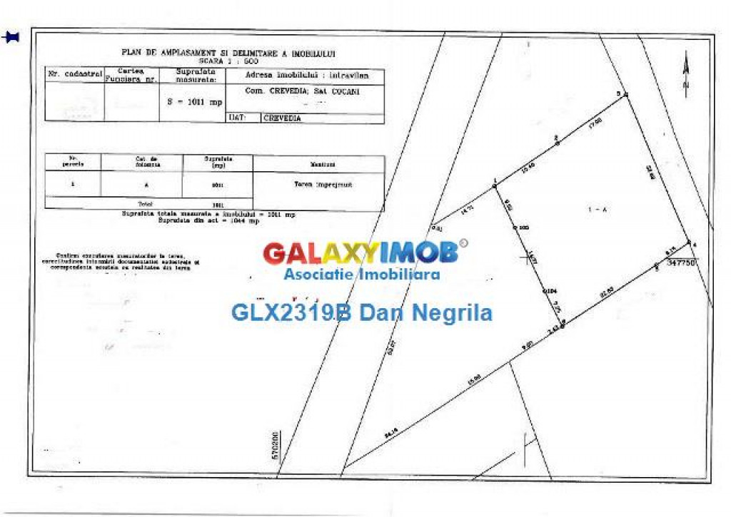 Oferta comision 0. Cocani, Dambovita , teren intravilan 1011mp, ingradit, acte la zi, utilitati ,,la poartaquot;. Certificat urbanism intravilan-arabil, extras CF, nr. postal. Regim Juridic:intravilan conf. PUG, intabulat in CF. Crevedia. Regim Economic: Folosinta intravilan-arabil 1011mp conform extras CF. Regim tehnic: Conform PUG al comunei Crevedia. Pret usor discutabil, cash sau credit. Detalii la telefon. Informatii eficienta energetica: