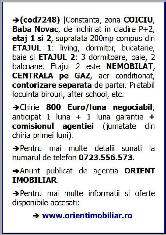 (cod7248) | Constanta, zona COICIU, Baba Novac, de inchiriat in cladire P+2, etaj 1 si 2, suprafata 200mp compus din ETAJUL 1: living, dormitor, bucatarie, baie si ETAJUL 2: 3 dormitoare, baie, 2 balcoane. Etajul 2 este NEMOBILAT, CENTRALA pe GAZ, aer conditionat, contorizare separata de parter. Pretabil locuinta birouri, after school, etc. Chirie 800 Euro/luna negociabil; anticipat 1 luna + 1 luna garantie + comisionul agentiei (jumatate din chiria primei luni). Pentru mai multe detalii sunati la numarul de telefon 0723.556.573. Anunt publicat de agentia ORIENT IMOBILIAR.