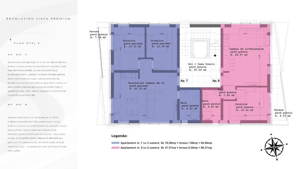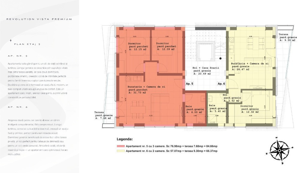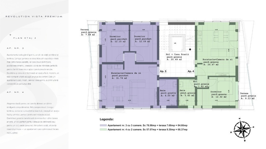 NEW! Descopera cel mai nou si modern complex rezidential REVOLUTION VISTA PREMIUM, situat in zona Catedralei Sfanta Treime, pe Bdul Republicii 44 din Baia Mare, un proiect marca Revolution Residence. Va propunem spre vanzare apartamente cu 3 camere ce au o suprafata de 76.98 mpc plus terasa in suprafeta de 7.68mpc. Achizitioneaza unul din apartamentele cu 3 camere si beneficiezi de design gratuit pentru amenajarea camerei de baie. Detalii proiect: * imobil locuinte P+4Etaje si cuprinde un total de 8 unitati de apartamente * locatie: Bdul Republicii 44, Baia Mare * fatada ventilata, costuri reduse in viitor legate de intretinerea exterioara * termoizolatie exterioara realizata cu vata bazaltica de 15 cm * peretii interiori dintre apartamente si cei comuni cu, casa scarii sunt formati din doua randuri de caramida plus vata bazaltica, pentru un confort termic si fonic sporit * design ultra modern * finisaje moderne * parcare exterioara * supraveghere video * acces privat * lift * spatii comerciale la parterul blocului * design interior personalizat pentru spatiile comune * pozitionare excelenta, blocul fiind retras, ferit de agitatia orasului, pozitionarea fiind intr-o zona linistita * standarde ridicate de siguranta si calitate * imobilul se vinde locuibil, cu instalatie de incalzire prin pardoseala si centrala termica in condensare Facilitati zona: * culte religioase, Catedrala Sfanta Treime, la cca 200m distanta * mall Shopping Park Baia Mare, la cca 250m distanta * supermarket Lidl, Kaufland, la cca 250m distanta * zona relaxare, parcul central, cca 500m distanta * unitati de invatamant, cca 250m distanta * zona cazare, hotel Europa, la cca 800m distanta * statii alimentare Petrom, la cca 50m distanta Preturi incepand de la 1450Euro mpc + TVA, care se va aplica conform normelor in vigoare. Pentru mai multe detalii, ne puteti contacta la numarul de telefon 0372.477.477 0774.049.796
