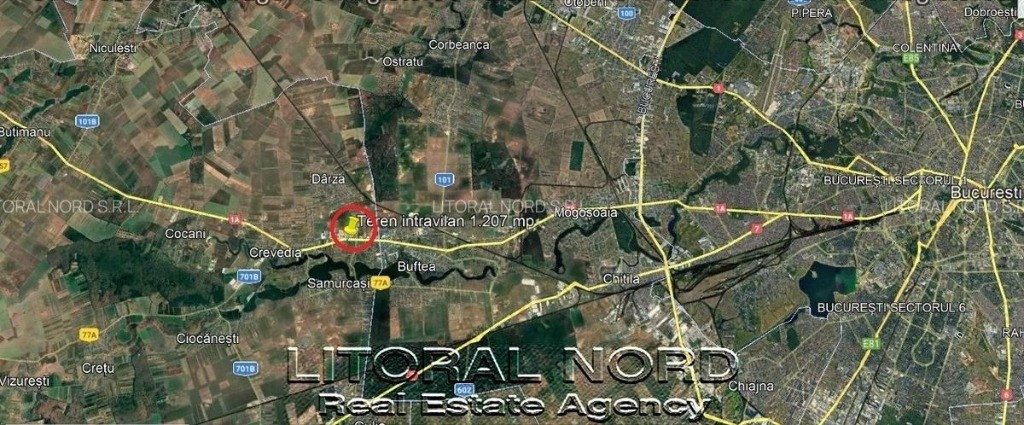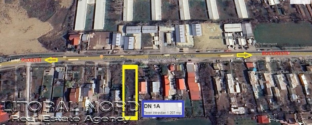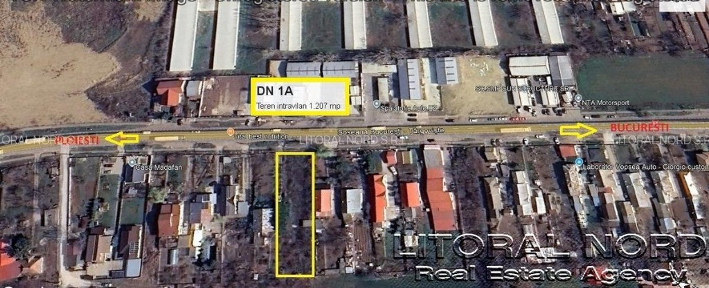 Proprietate intermediata exclusiv de agenția LITORAL NORD S.R.L. Comision 0% pentru cumparator. Comuna Crevedia - Sat Manastirea, DN 1A, Str. Bucuresti - Targoviste nr. 225 C, teren intravilan cu suprafata de 1.207 mp, cu deschidere la DN 1A de 16,30m, situat pe partea stanga, cum se merge din Bucuresti spre Ploiesti, Targoviste, pozitie foarte buna, cu mare potential pentru activitati comerciale, industriale sau de investitie. Pe teren s-a forat si s-a facut un put de apa. Utilitati: apa, curentul, gazele si canalizarea sunt la strada. Acte: cadastru, intabulare. Detalii suplimentare, agentia Litoral Nord, tel: 0720300272