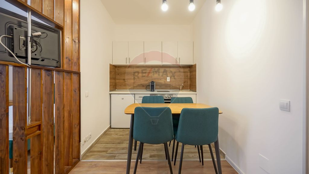 Vă prezint spre inchiriere o garsoniera mobilata si utilata complet situata in complexul rezidential Seasons Residence, Drumul Poienii. Este situata la parter cu orientarea spre Schei, la liziera padurii si cu o panorama spre centrul orasului. Este formata din camera ce detine pat matrimonial si o canapea extensibila, bucatărie, baie si un dressing, cat si o gradina de 18 mp. Dotarile si finisajele rafinate la care se adauga si atentia proprietarului, aduc un bun gust imobilului pentru a capta esenta unei locuintei moderne si confortabile. Proprietatea se inchiriaza total mobilata si utilata. Optional, se poate inchiria si un loc de parcare subteran contracost. Este ideal pentru o persoana sau un cuplu, ce isi doreste o locuinta moderna, intr-o zona linistita si foarte aproape de punctele centrale ale orasului. Situat pe un deal si avand in fata Brasovul vechi, Seasons Residence este influentat direct de peisajul bogat din regiune si de topografia deluroasa. Cele patru anotimpuri sunt perfecte in acest loc. Aici veti gasi o locuinta cu munti ametitori in zare şi copaci fosnitori de jur imprejur, precum si un spatiu confortabil si modern in interior, fiind aproape de centrul orasului. Garantia este cuantumul a doua chirii. Pentru detalii suplimentare, vă stau cu drag la dispoziție!
