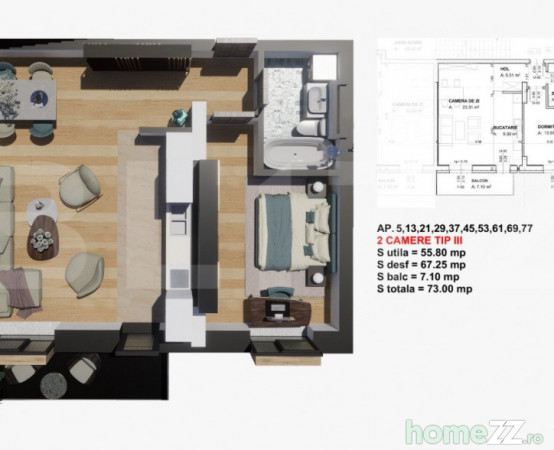 Imobilul dotat cu centrala murala in condensatie, incalzire in pardoseala, senzor de reglare a temperaturii in fiecare camera, finisaje la cele mai inalte standarde de calitate. Apartamentul este decomandat si are o suprafata utila de 55,8 mp si un balcon de 7,1 mp si este decomandat, compartimentat astfel: living spatios amenajat in stil open space impreuna cu bucataria, un dormitor, o baie si un hol . De asemenea, apartamentul dispune de balcon cu acces din living, ideal pentru momentele de relaxare.