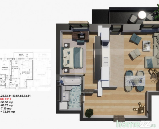 Imobilul dotat cu centrala murala in condensatie, incalzire in pardoseala, senzor de reglare a temperaturii in fiecare camera, finisaje la cele mai inalte standarde de calitate. Apartamentul este decomandat si are o suprafata utila de 56,5mp si un balcon de 7,1mp si este decomandat, compartimentat astfel: living spatios amenajat in stil open space impreuna cu bucataria, un dormitor, o baie si un hol . De asemenea, apartamentul dispune de balcon cu acces din living, ideal pentru momentele de relaxare.