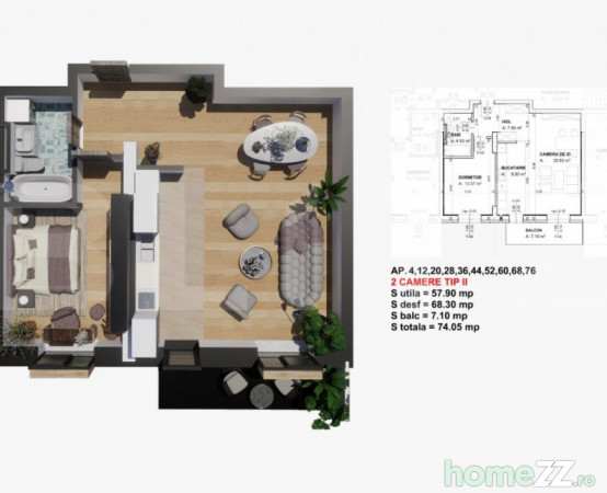Imobilul dotat cu centrala murala in condensatie, incalzire in pardoseala, senzor de reglare a temperaturii in fiecare camera, finisaje la cele mai inalte standarde de calitate. Apartamentul este decomandat si are o suprafata utila de 57,9 mp si un balcon de 7,1 mp si este decomandat, compartimentat astfel: living spatios amenajat in stil open space impreuna cu bucataria, un dormitor, o baie si un hol . De asemenea, apartamentul dispune de balcon cu acces din living, ideal pentru momentele de relaxare.