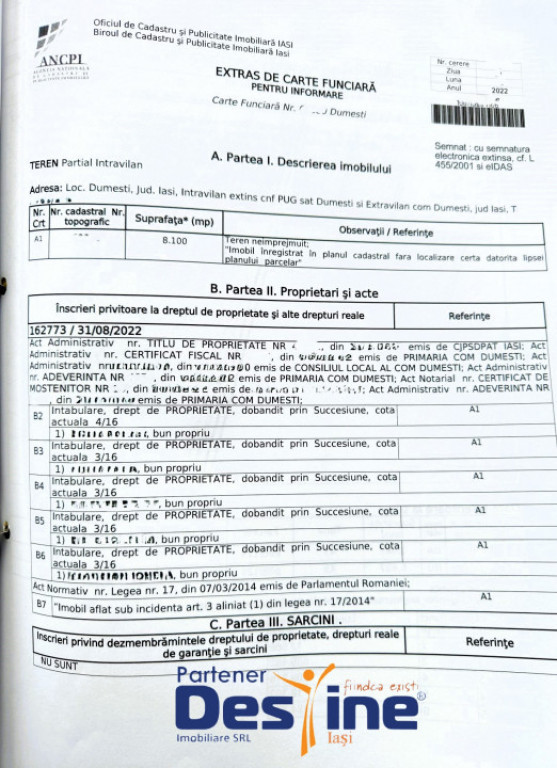 ~ E X C L U S I V I T A T E ~ COMISION 0% ~ *** DESTINE IMOBILIARE vă prezintă spre vânzare: ** TEREN intravilan + extravilan - 8100 mp * Preț: 79.900 € Detalii si informatii utile: - lungime teren - 645 ML - front stradal - 13.30 ML - TEREN INTRAVILAN - 1463 MP - TEREN EXTRAVILAN - 6637 MP Avantajele terenului : - locatie excelenta : exact in spatele PRIMARIEI DUMESTI - situat in zona cu constructii civile - utilitati : curent electric, apa potabila si canalizare - Drum pietruit, la 100 m de ASFALT Terenul se afla la o distanta aproximativa de 25 km de IASI. Este liber de sarcini iar documentatia este la zi, pentru tranzactionare. Localitatea Dumești este în dezvoltare, ceea ce poate duce la creșterea valorii terenurilor în viitor. Profita acum de oportunitate. Asadar, pentru vizionări sau informații suplimentare: TONI GALU - 0736.84.84.88 ????Cod ofertă: P-3665 Id intern: P3868