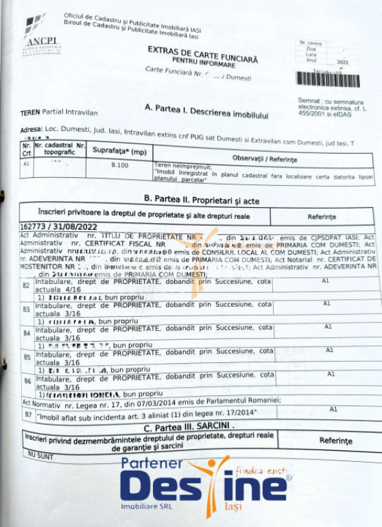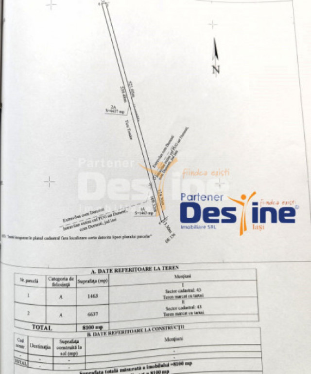 ~ E X C L U S I V I T A T E ~ COMISION 0% ~ *** DESTINE IMOBILIARE vă prezintă spre vânzare: ** TEREN intravilan + extravilan - 8100 mp * Preț: 79.900 € Detalii si informatii utile: - lungime teren - 645 ML - front stradal - 13.30 ML - TEREN INTRAVILAN - 1463 MP - TEREN EXTRAVILAN - 6637 MP Avantajele terenului : - locatie excelenta : exact in spatele PRIMARIEI DUMESTI - situat in zona cu constructii civile - utilitati : curent electric, apa potabila si canalizare - Drum pietruit, la 100 m de ASFALT Terenul se afla la o distanta aproximativa de 25 km de IASI. Este liber de sarcini iar documentatia este la zi, pentru tranzactionare. Localitatea Dumești este în dezvoltare, ceea ce poate duce la creșterea valorii terenurilor în viitor. Profita acum de oportunitate. Asadar, pentru vizionări sau informații suplimentare: Cod ofertă: P-3665 Id intern: P4668
