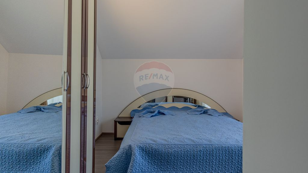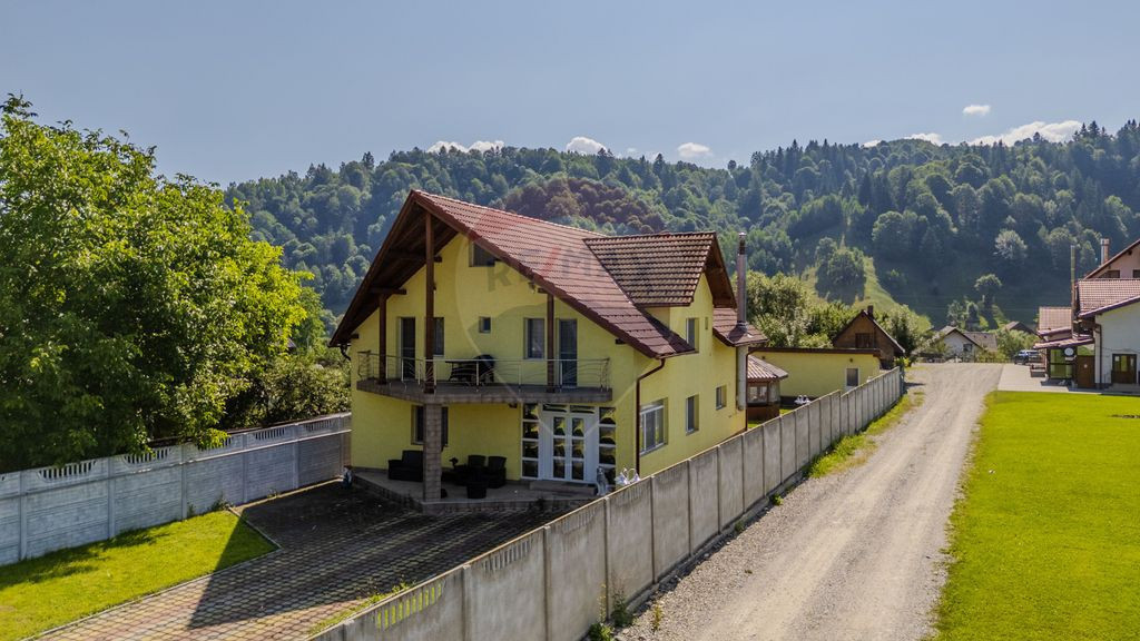 Vilă de vânzare | Reprezentare exclusivă | 0% comision cumpărător Sunt Ionela Ciobotă de la RE/MAX Evolution și astăzi îți propun spre vânzare, în sistem de reprezentare exclusivă o proprietate cu adevărat specială, situată în Moieciu de Jos, județul Brașov, într-un cadru natural de excepție, la poalele Munților Bucegi. Amplasată pe un teren generos de 1.074 mp, această vilă impresionează prin funcționalitate, spațiu și versatilitate, fiind ideală atât pentru locuire, cât și pentru investiție. Cu o suprafață utilă de 208 mp, proprietatea dispune de 10 camere, dintre care 9 dormitoare, concepute pentru confort și intimitate. Șapte dormitoare beneficiază de baie proprie, iar două dormitoare sunt deservite de o baie comună. Compartimentare armonioasă: Parterul întâmpină printr-un living luminos și primitor, o bucătărie spațioasă cu zonă de dining, hol generos, două dormitoare cu baie proprie și o cameră tehnică dotată cu două centrale – pe gaz și pe lemne. Etajul oferă cinci dormitoare, fiecare cu baie proprie. Două dintre acestea sunt orientate spre fața casei și dispun de terasă, alte două spre partea din spate, de asemenea cu terasă, iar un dormitor lateral completează nivelul, păstrând aceeași notă de confort. Mansarda găzduiește două dormitoare luminoase, unul cu vedere spre față și unul spre spatele proprietății, deservite de o baie comună cu cadă. Exterior – un spațiu gândit pentru relaxare: Curtea este amplă și atent amenajată, oferind: -cinci locuri de parcare; -foișor generos, construit pe placă de beton, cu structură metalică și pereți, încălzit cu șase calorifere și deservit de centrală proprie, ideal pentru utilizare pe tot parcursul anului; -anexe multiple, ce includ bazin propriu de apă, spații de depozitare, mașină de spălat, frigider, baie suplimentară pentru oaspeți, precum și o centrală dedicată curții și foișorului. Potențial investițional: Prin compartimentare, dotări și poziționare, această proprietate este o oportunitate excelentă pentru dezvoltarea unei pensiuni sau a unui boutique hotel, dar și o alegere ideală pentru o familie numeroasă care își dorește spațiu, liniște și natură. Moieciu de Jos este recunoscută pentru farmecul său autentic, peisajele spectaculoase și aerul curat, fiind o destinație apreciată de turiști și iubitorii de munte. Pentru detalii suplimentare sau pentru a programa o vizionare, vă invit să mă contactați.