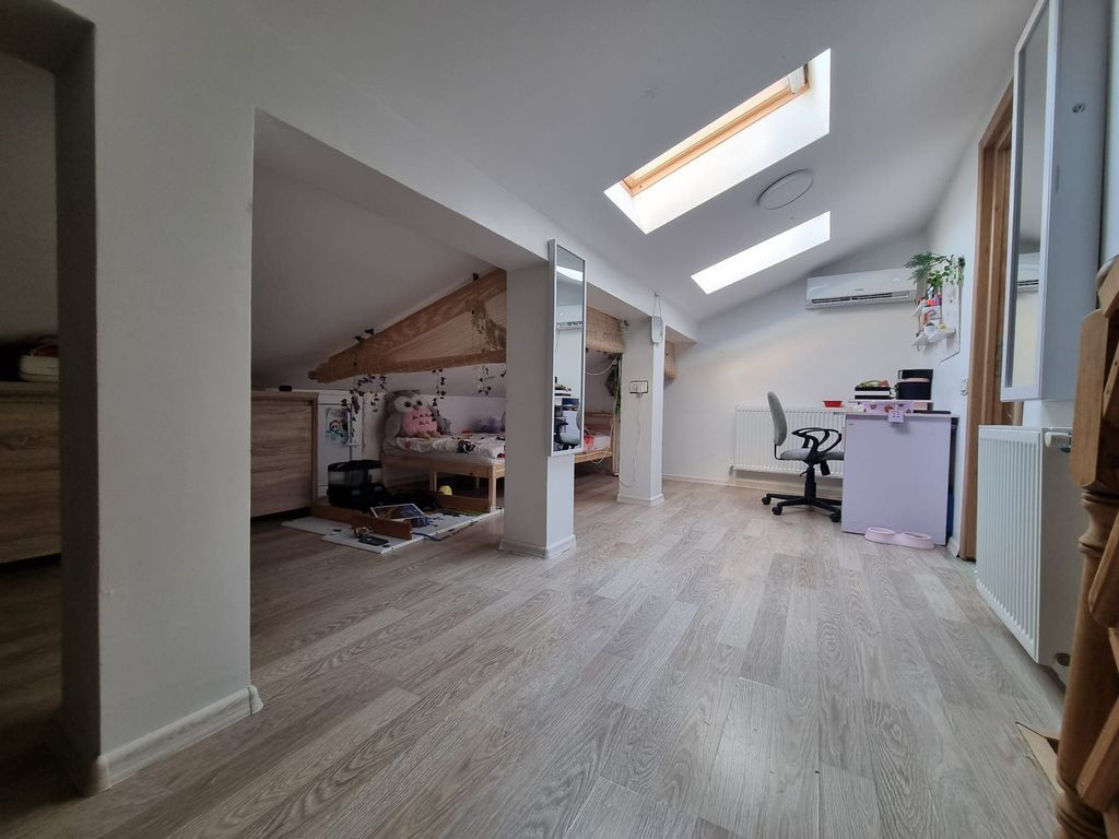 --Acord imobiliar va propune spre vanzare un apartament de 3 camere decomandat cu o extindere catre pod cu scara interioara,podul finisat complet pt locuit fiind compus din zona de birou cu zona pt dormit,baie, spatii de depozitare, exista si 2 ferestre de mansarda Velux,apartamentul este finisat modern cu materiale premium,centrala gaze,izolat exterior,dispune si de 2 locuri de parcare subterane care se vand separat(10000 eur),zona comerciala f aproape,ideal pentru o famile tanara,recomand vizionare