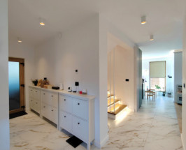 - Incalzire in pardoseala, cu distribuitor pe fiecare etaj si circuite independente, controlate cu termostate smart Poer in fiecare camera si pe fiecare hol