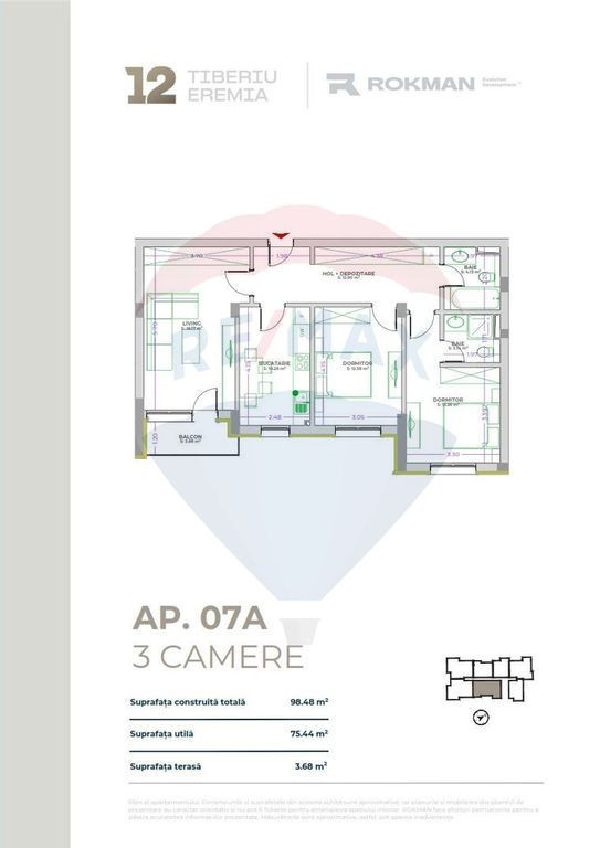 Descoperiți ROKMAN - Oportunitatea dvs. unică de a trăi visul urban modern în inima Brașovului! Cu o adresă prestigioasă pe Strada Tiberiu Eremia 12, ROKMAN redefinește confortul și stilul, oferind o selecție exclusivistă de 73 de apartamente - de la studiouri intime, la unități spațioase cu 2 și 3 camere, fiecare proiectat cu grijă pentru a maximiza spațiul și lumina naturală. Avantaje Exclusive: • Localizare: Acces rapid la facilitățile orașului, inclusiv școli, parcuri și zone comerciale, la o distanță de sub 2km de Coresi Shopping Mall • Design Modern: Arhitectură contemporană cu finisaje de înaltă calitate și atenție la detalii. • Flexibilitate: Apartamente configurate pentru a se potrivi stilului dvs. de viață. • Parcări Convenabile: Opțiuni de parcare supraterană și subterană pentru a vă asigura că vehiculul dvs. este mereu în siguranță și la îndemână. Spatii Comerciale: Trei spații comerciale la parter, ideale pentru afaceri care doresc să prospere într-un mediu dinamic. Investiție Inteligentă: ROKMAN Residence nu este doar un cămin, ci și o investiție valoroasă într-una dintre cele mai căutate locații din Brașov. Pentru mai multe informații și pentru a vă rezerva locul în comunitatea ROKMAN Residence, contactați-ne astăzi! Prețul nu conține TVA! Bogdan Preda - 0726102852