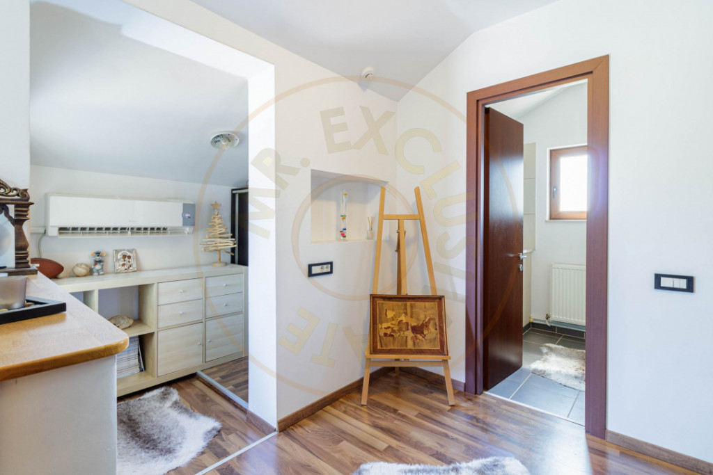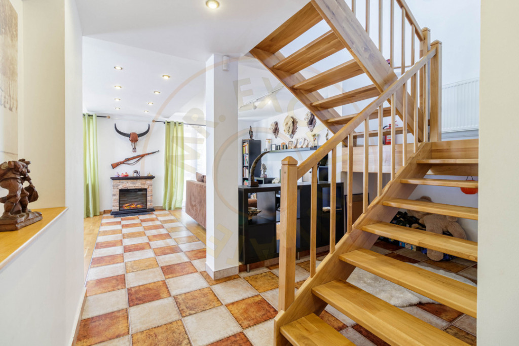 Vă propun spre vânzare o locuință individuală situată într-o zonă liniștită, înconjurată de natură, cu acces facil către școli, magazine, farmacii, restaurante și transport în comun. Proprietatea dispune de un teren total de 418 mp, cu o suprafață construită (casă + garaj) de 181 mp și curte liberă de aproximativ 305 mp, amenajată cu gazon, pomi fructiferi și plante ornamentale. Casa este compartimentată pe Parter + Etaj și include living luminos, bucătărie open-space (cu posibilitate de închidere), 2 dormitoare spațioase, 2 băi, terasă acoperită și spații multiple de depozitare. În curte se află un garaj închis pentru 2 mașini, care poate fi folosit și ca birou sau spațiu pentru oaspeți, precum și două anexe (cameră tehnică și cămară). Construcția este realizată în 2010 (fundație beton, structură lemn), iar documentația completă este disponibilă. Locuința beneficiază de încălzire în pardoseală și calorifere, sistem de supraveghere video și alarmă, aer condiționat pe fiecare nivel, poartă electrică, sistem automat de irigare și costuri reduse la utilități (puț propriu + sistem rezervă apă). Pentru detalii suplimentare și programarea unei vizionări, vă stau la dispoziție. Id intern: P7989