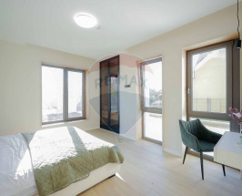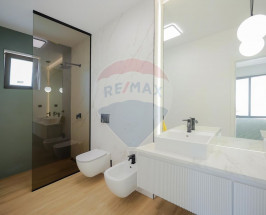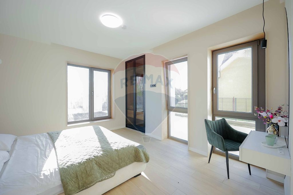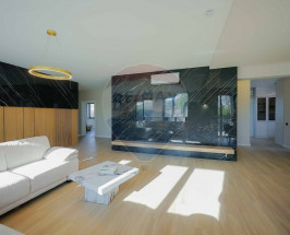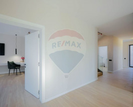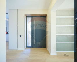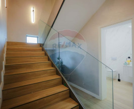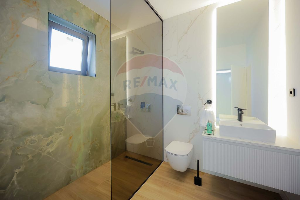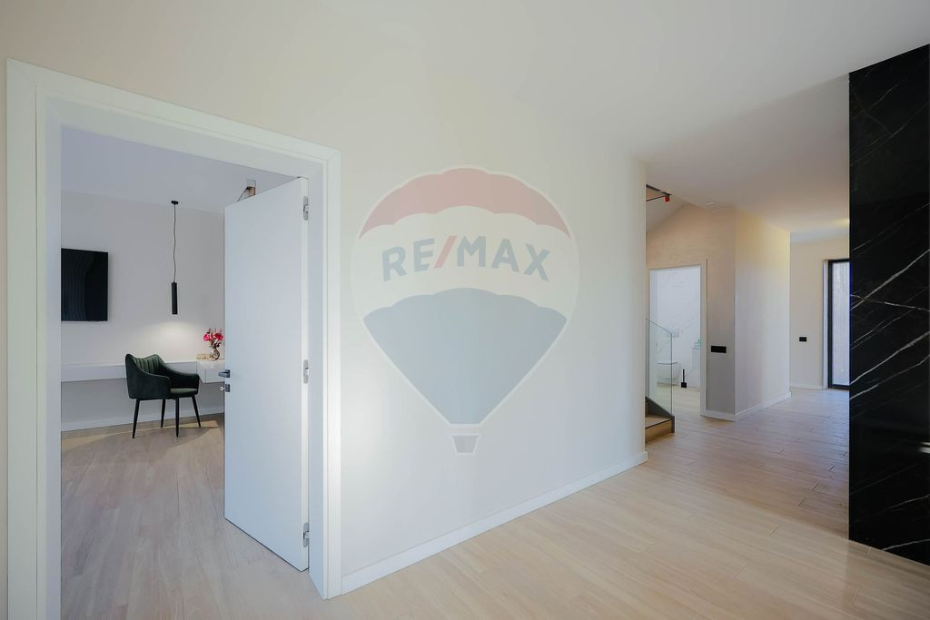 Interiorul impresionează prin finisaje premium și elemente realizate special: ușile din lemn masiv executate la comandă, mobilierul din lemn cu iluminare LED activată la deschidere, riflajele interioare din lemn masiv cu LED încorporat, paturile din camere tapițate integral, cu sistem LED personalizat, toate acestea contribuind la unicitatea locuinței. Băile sunt echipate cu instalații sanitare Ideal Standard, iar mobilierul lor, realizat custom made din MDF cu blat ceramic, se potrivește perfect cu gresia și faianța Marazzi folosită.