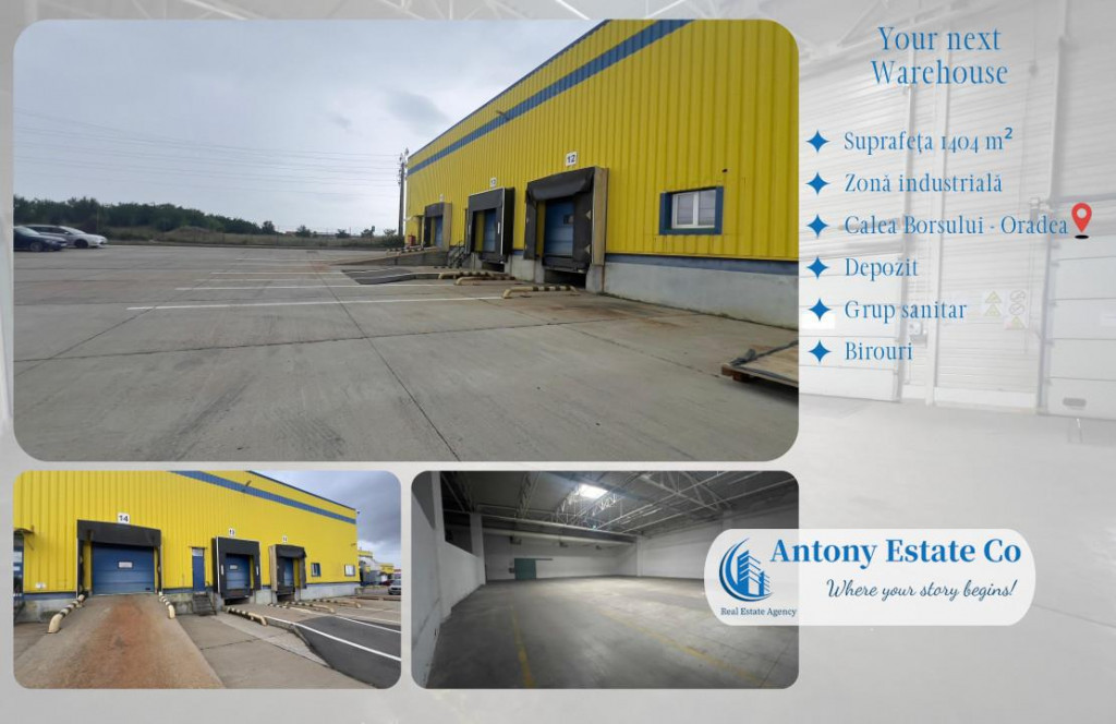 Va propunem spre inchiriere in exclusivitate o Hala Industriala aflata intr-o zona de maxim interes, situata pe Calea Borsului, Oradea. Pretul chiriei este de 4.2 EUR/mp EUR fara TVA - 5.900 EUR fara TVA (4.99 EUR/mp - 7.000 EUR cu TVA inclus). La pretul chiriei se adauga o taxa de mentenanta de 0,65 EUR/mp. Atentie, pretul chiriei este negociabil in functie de perioada contractuala . Caracteristicile imobilului: - Suprafata totala utila 1404 mp; - Spatiu depozitare 1307 mp; - Grupuri sanitare 18 mp; - Birouri 79 mp; - Porti Acces TIR. Icirc;ncalzirea este asigurata prin centrala pe gaz, cu ventiloconvectoare. La preluarea imobilului, se percepe valoarea cumulata a minim (3) chirii lunare, ca si garantie. Icirc;n apropierea acestui imobil se gasesc: Statie de autobuz, Gradinite, Scoli, Restaurante, Hoteluri. Acces facil la centura orasului. Informatiile tehnice au caracter orientativ, acestea fiind preluate de la proprietar. Pentru mai multe detalii si vizionari, ne puteti contacta telefonic la numarul din anunt. Antony Estate CO - Where your story begins!