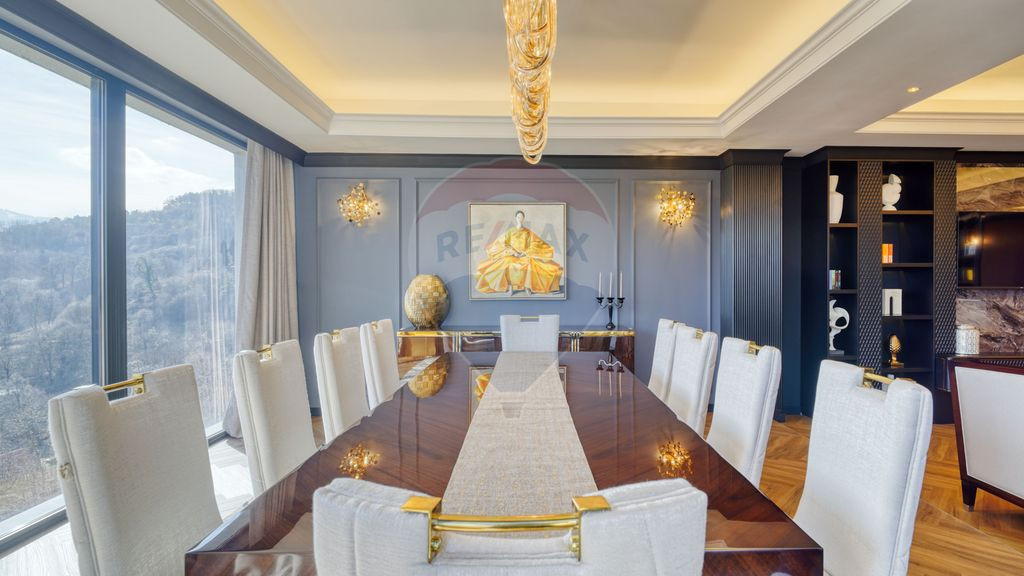 Pe Calea Poienii, acolo unde orașul urcă spre pădure și lumina se filtrează diferit la fiecare oră a zilei, există o rezidență care nu poate fi încadrată în nicio categorie clasică. Este mai mult decât un apartament — este o expresie a rafinamentului, o scenografie a luminii, un spațiu unde arhitectura, materialele și emoția se împletesc într-o singură experiență. Interiorul te întâmpină cu o eleganță calmă, sofisticată, construită pe texturi fine și proporții impecabile. Marmura caldă, lemnul natural, panourile decorative, accentele metalice și iluminatul sculptural creează un ritm vizual care curge firesc dintr-o încăpere în alta. Fiecare suprafață, fiecare reflex și fiecare detaliu pare gândit pentru a fi trăit, nu doar privit. Livingul, un spațiu generos deschis către panoramă, devine un amfiteatru privat al Brașovului. Tâmpa, centrul istoric și culmile Postăvarului se desfășoară în fața ta ca un tablou în continuă schimbare. Lumina se mișcă lent pe suprafețe, se joacă pe marmură, se reflectă în sticlă și creează o atmosferă pe care o întâlnești doar în rezidențe atent curate din marile capitale ale lumii. Bucătăria este o piesă de design contemporan: linii curate, texturi calde, insulă centrală, vitrine iluminate și detalii fine, unde estetica și funcționalitatea se completează perfect. Este un spațiu în care fiecare element are un rol, fiecare finisaj spune o poveste. Dormitoarele transmit liniște și intimitate. Materialele moi, lumina caldă, scenografia atent compusă și senzația de spațiu creează un refugiu ideal pentru odihnă autentică. Baia principală, cu trepte de marmură, duș walk-in și cadă sculpturală, respiră aerul unui spa privat, unde timpul încetinește. În centrul apartamentului descoperi elementul său cel mai rar: o grădină japoneză tip tsuboniwa, un colț zen cu pietriș alb, vegetație minimalistă și statuară, complet înconjurat de sticlă. Un spațiu meditativ, pur, care aduce natura în interior și oferă un sentiment de calm greu de descris, dar ușor de simțit. Terasele, una dintre ele de peste 100 mp, deschid locuința către exterior și creează un dialog între casă și natură. De aici vezi orașul, pădurea, muntele — un echilibru perfect între intimitate și grandiozitate. Rezidența este complet mobilată și utilată cu piese de design atent alese, corpuri de iluminat sculpturale, mobilier custom, materiale premium și detalii care transformă spațiul într-un univers personal pentru cineva care caută nu doar lux, ci luxul trăit autentic. Vizionarea acestei proprietăți se realizează exclusiv după o discuție preliminară, într-un cadru relaxat, la o cafea, pentru a înțelege nevoile și compatibilitatea cu stilul de locuire pe care îl oferă. Punem la dispoziție video de prezentare, tur virtual, planuri și documentație completă, iar programarea vizitei se face ulterior, personalizat.
