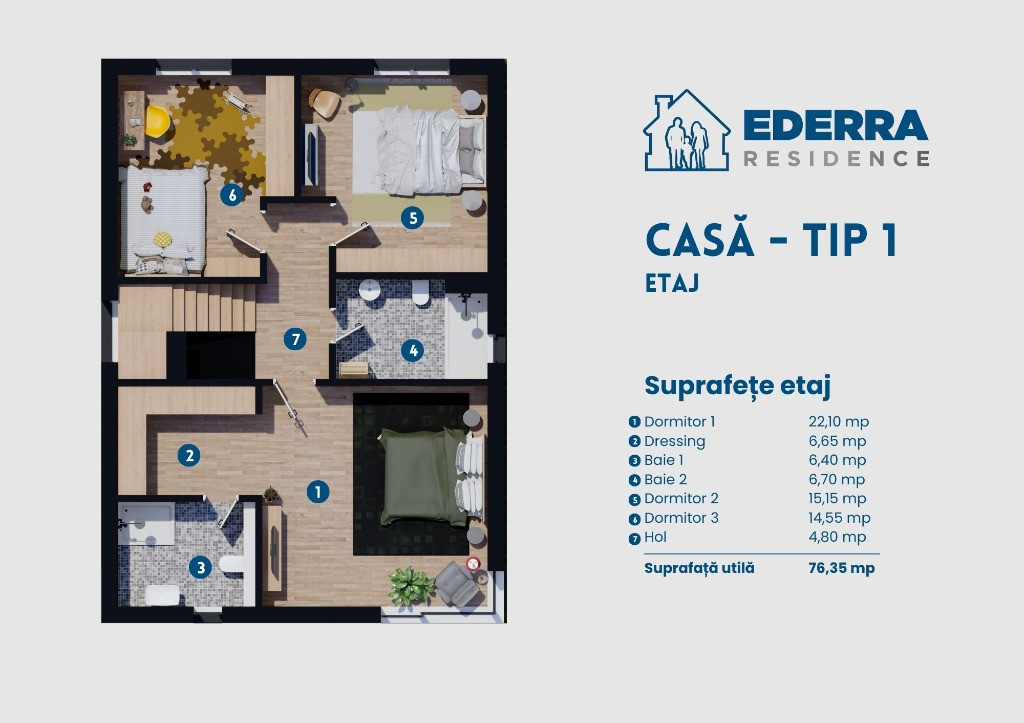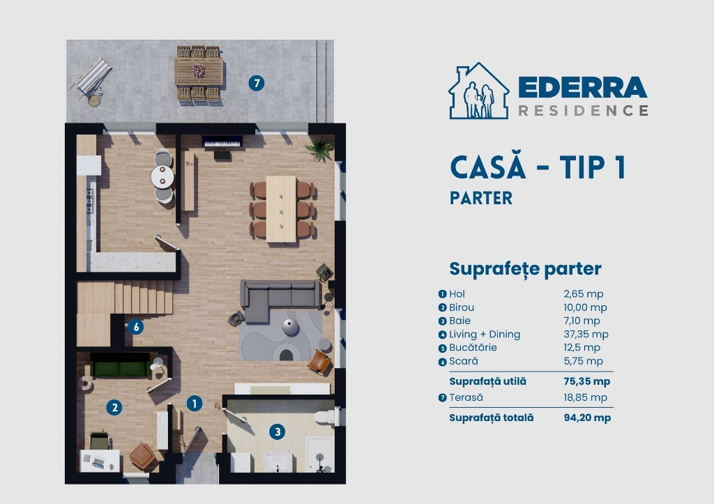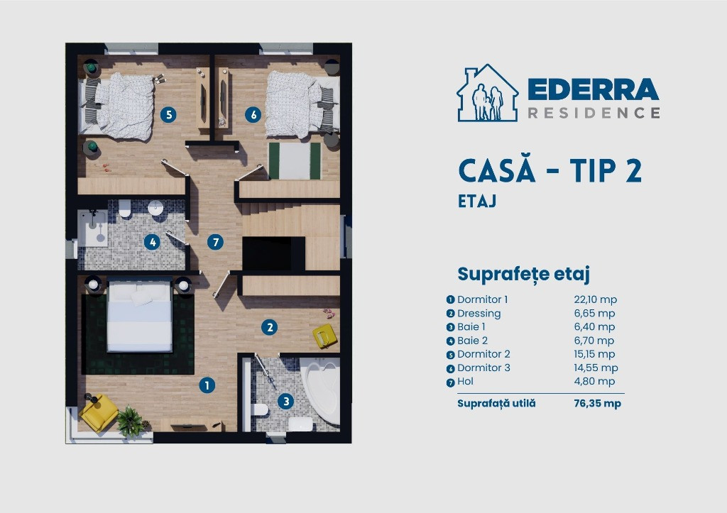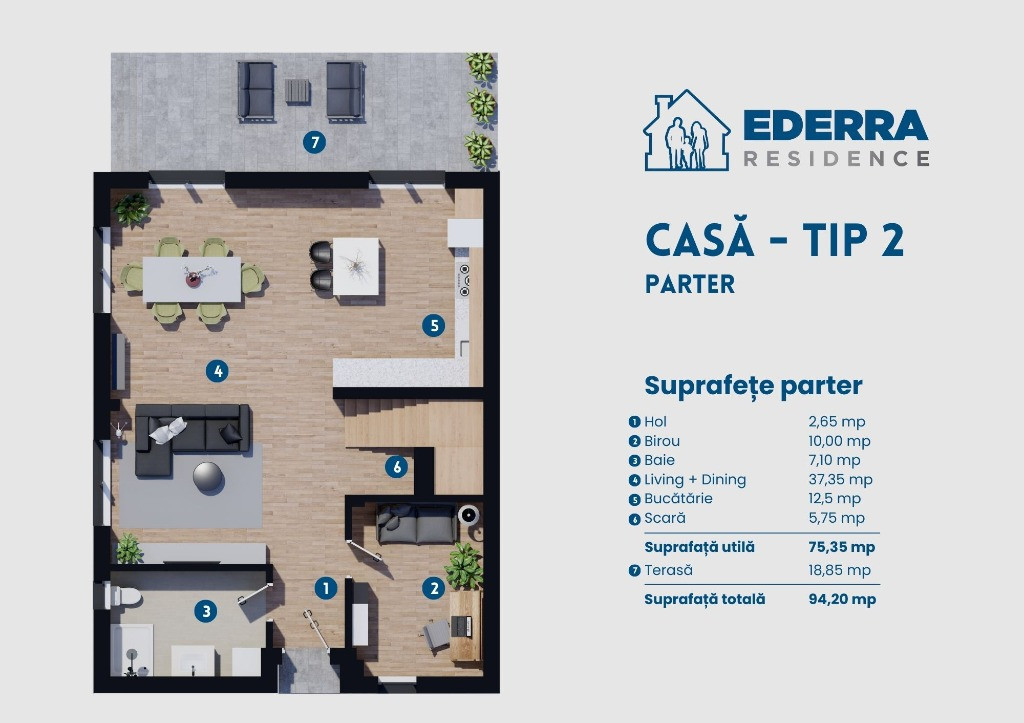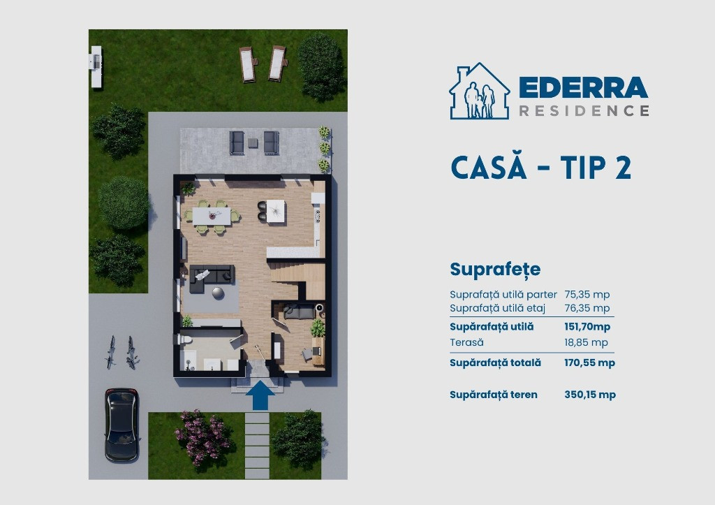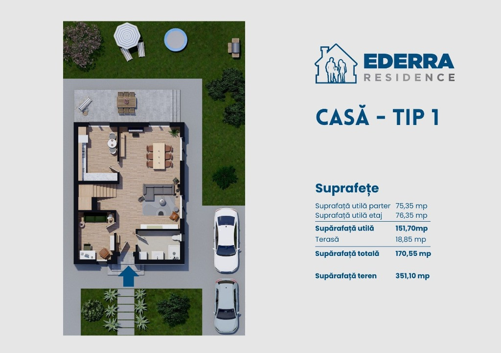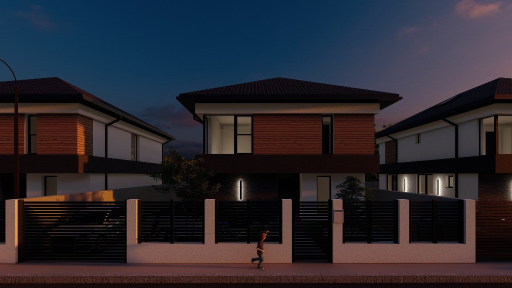 Amplasate pe un teren individual de 351 mp, locuintele (P+1+pod) locuintele Ederra Residence 2 au suprafete de 210 mp construiti si 170,55 mp utili+80mp la mansarda,fiind compartimentate astfel incat sa asigure un confort ridicat. Cele 24 de vile sunt compartimentate astfel: PARTER Suprafata construita=111 mp Suprafata utila=94,2 mp ETAJ Suprafata construita=99,15 mp Suprafata utila=76,35 mp Locuintele vor fi livrate complet finisate si utilate. Finisajele sunt de calitate premium( Delta Studio) cu posibilitatea de a alege intre mai multe modele disponibile. Sistemul constructiv este din caramida Porotherm de 25 cm grosime,termoizolat cu un strat de 10 cm de polistiren expandat, pentru pentru o buna rezistenta si eficienta termica.Peretii de compartimentare sunt din caramida porotherm de 12cm.Placa de beton peste etaj. Regim inaltime P+1+M Sistem de incalzire in pardoseala , centrala termica pe gaz cu termostat de reglare a temperaturii .Pardoselile vor fi din parchet de ce mai buna calitate (laminat), agrementat pentru incalzirea in pardoseala, in bai se monteaza gresie si faianta de inalta calitate. Tamplaria este profil Veka cu geam tripan, termo si fono izolant. La pretul afisat se adauga TVA 21%. Link prezentare complex: https://youtu.be/SXoYhZ-svp0