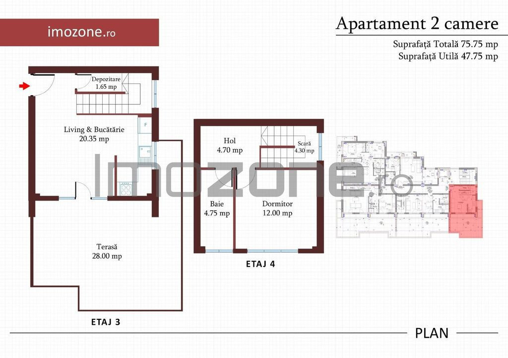 Disponibil spre achizitie apartament de 2 camere cu terasa distribuit pe 2 etaje- 3 si 4, cu o suprafata de 47 mp utili+ 28 mp de terasa. Proprietatea se vinde finisata completa. Dispune de centrala proprie. Bloc cu lift de 6 persoane. * Optional loc de parcare subteran sau în exterior. Statia de metrou - Raul Doamnei la 12 minute distanta de bloc Statia STB: 122, 22,322,385,485, 422, 423, 425 - la 5 minute distanta de bloc. Comisionul este 0%. Pretul nu include Tva