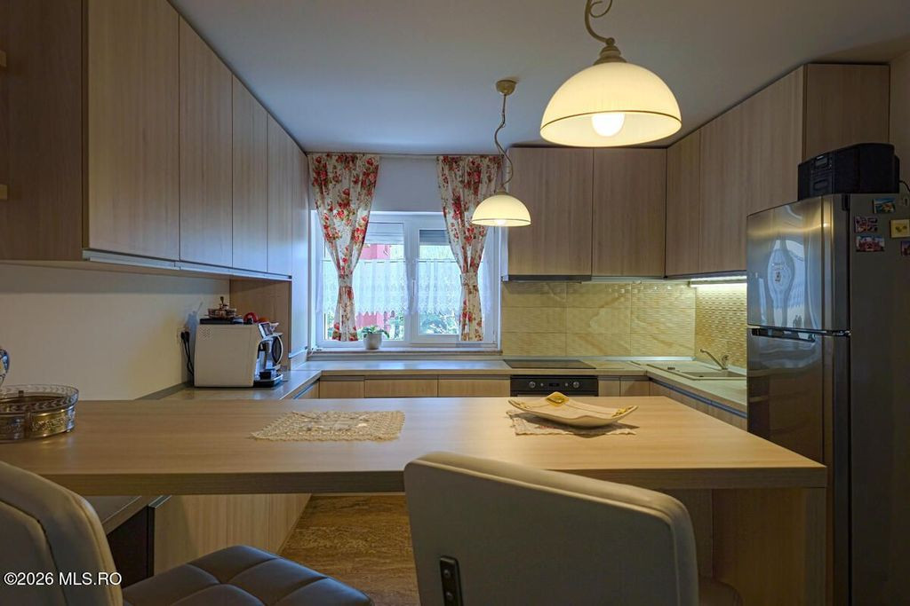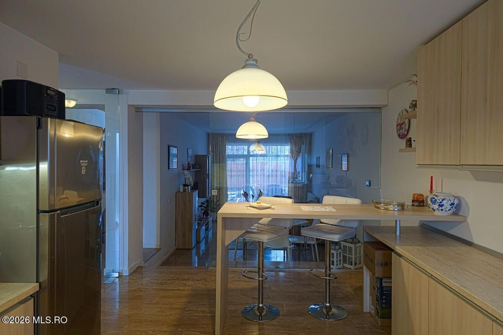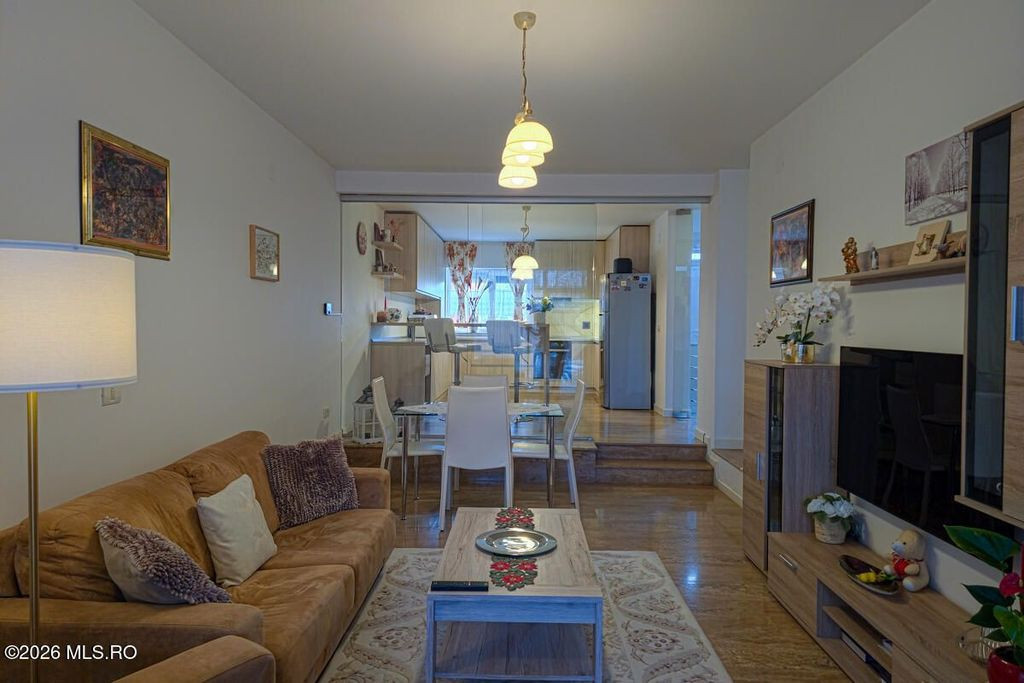 DUMBRAVITA - STR SOARELUI - CASA P+1, 3 CAMERE, PARCARE ACOPERITA. Comunitate selecta, magazine, scoli, restaurante in proximitate, acces facil spre oras, aeroport si autostrada. Townhouse bine gandit, constructie solida, spatii luminoase, bine proportionate. Complex rezidential privat, curte amenajata, terasa cu dining exterior si deck la etaj, parcare acoperita. Living reprezentativ, bucatarie inchisa cu pereti de sticla, mobilier custom-made și electrocasnice premium, dormitoare generoase, bai cu finisaje de top