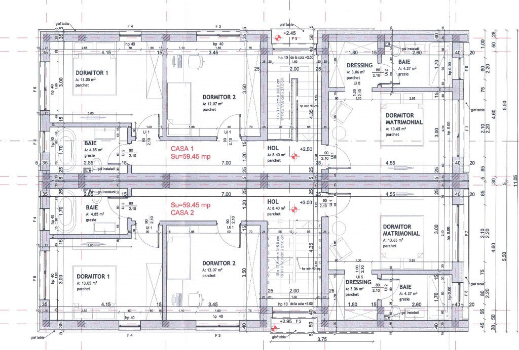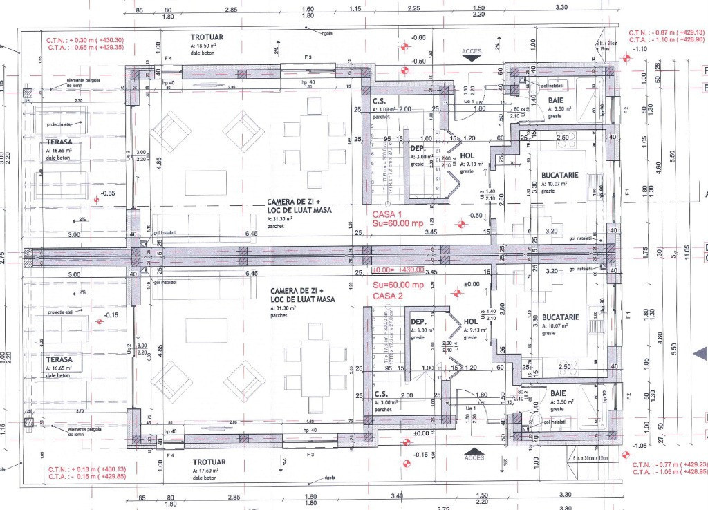 Stadiul actual al constructiei finalizata pe exterior: structura caramida, izolatie 15 cm polistiren, vopsea decorativa de culoare maro, aplicatii de caramida aparenta klinker, usa la intrare din termopan Rehau, tamplaria din termopan Rehau 3 sticle, panoramic view din cele 2 terase care vor avea balustrada din sticla securizata; la interior semifinisata instalatiile electrice, tencuit, instalatii termice termice ( va fi incalzirea prin pardoseala ) si sanitare si gletuit; centrala termica nu se monteaza. Acces asfaltat pana la duplex, bransament la utilitati, gardul de delimitare si imprejmuire cu fundatie din beton stalpi si plasa sudata; In fata duplexului vor fi amenajate 2 locuri de parcare pentru fiecare unitate de duplex. Suprafata unei unitati din duplex 119 mp utili, construit pe o parcela de 240 mp, compartimentare : decomandat total astfel suprafata utila la parter este de 60 mp alcatuita din acces hol 9.13 mp, spatiu depozitare 3 mp, spatiu depozitare sub casa scarii 3 mp, baie cu geam 3.50 mp, bucatarie decomandata 10.07 mp, hol, camera de zi cu loc de luat masa 31.30 mp si acces in terasa 16.65 mp si trotuar lateral 18.50 mp; suprafata etaj superior 59.45 mp alcatuit din : hol 8.40 mp, dormitor matrimonial 13.65 mp ( baie proprie 4.37 mp si dressing propriu 3.06 mp), al II-lea dormitorul 12.07 mp, al III-lea dormitor 13.05 mp, baie 4.85 mp si acces cu casa scarii zidita si izolata pe acoperisul tip terasa avand doua orientari in functie de unitatea dorita ( Nord-est-sud sau Sud-vest-nord). Pretul de vanzare pe unitate de duplex 255.000 euro, constructia este persoana fizica si nu plateste Tva. Se vinde prin intermediul agentiei imobiliara comision 2% la tranzactionare.