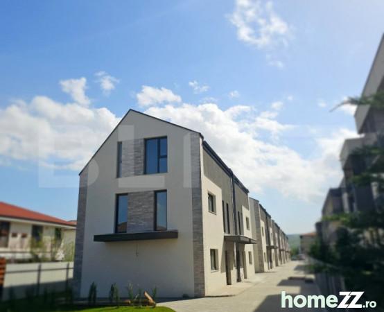 Imobilele sunt constructie noua, racordate la toate utilitatile, cu finisaje de foarte buna calitate, stalpi beton armat; pereti exteriori : zidarie caramida 25 cm, sistem termoizolant, polistiren expandat EPS 150 mm, placaj caramida aparenta, tencuiala+glet+zugraveala; piatra naturala pe fatada, acoperis tabla Bilka, sistem fluvial, tamplarie Salamander, incalzire in pardoseala cu centrala proprie pe gaz Immergas, colectare apa de ploaie in camine individuale, fundatie adanca intre 2,10m-1,60m. Totodata dispune si de instalatie pentru montare panuri fotovoltaice si priza pentru incarcare masini electrice.