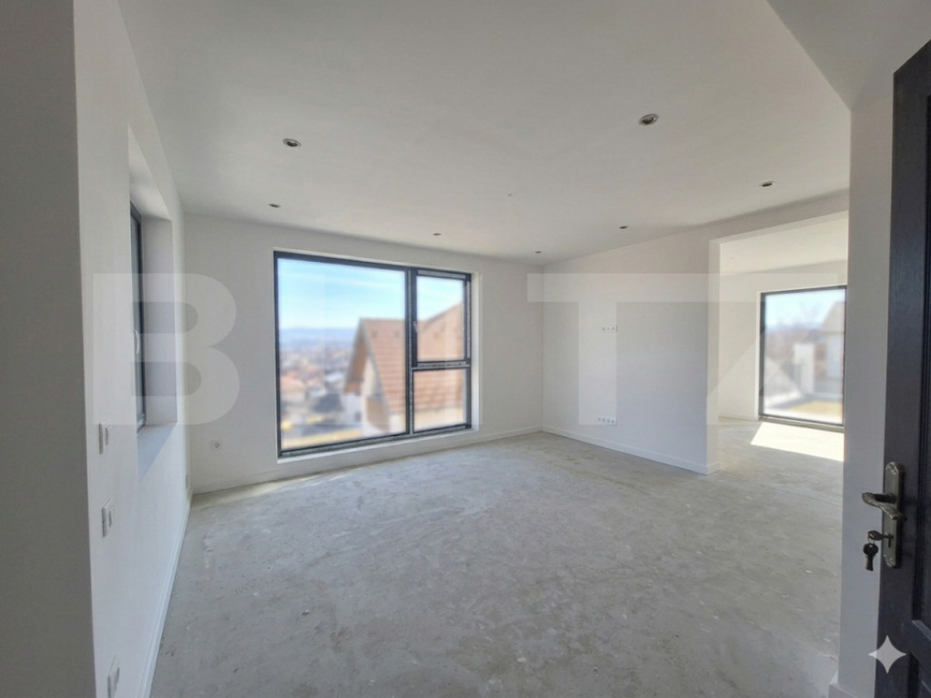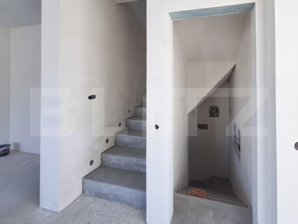 Blitz vă propune spre vânzare un duplex modern situat într-o zonă liniștită, ideală pentru familii, cu o panoramă spectaculoasă asupra peisajului înconjurător. Sunt disponibile ambele unități : Unitatea din față (cu 2 garaje, panoramă spre oraș) – 156 mp utili (inclusiv garaje) + Pod (~30-40 mp utili) => 375 000 euro Unitatea din spate (cu pivniță și cameră tehnică) – 163 mp utili (inclusiv subsol) + Pod (~30-40 mp utili) => 370 000 euro La mansardă înaltă, pentru unitatea din spate se vor amenaja 2 băi, în loc de una. Parcela de teren: 470 mp (inclusiv amprenta casei) + 100 mp drum (50 mp pentru fiecare unitate), drum ce va fi asfaltat în curând, iar Primăria va achiziționa cei 100 mp de la proprietari atunci când va veni să finalizeze lucrările de asfaltare. Predare la stadiul de semifinisat, astfel: 2 maini de glet, lavabil alb, geamuri termopan cu 7 camere, izolație exterioară, centrală termică proprie si ncălzire prin pardoseală, instalatii electrice și sanitare trase pe poziție, acoperiș din tablă, exterior amenajat. Pentru mai multe detalii sau o vizionare, vă așteptăm cu drag! Cod ofertă / ID BLITZ: P136958 Id intern: P136958