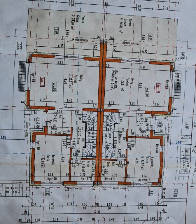 Parter: hol 3.23 mp; debara 1.22 mp; bucatarie separata 12.83 mp; baie 4.55 mp; casa scarii 4.83 mp; living 25.51 mp si iesire in terasa 25.8 mp;