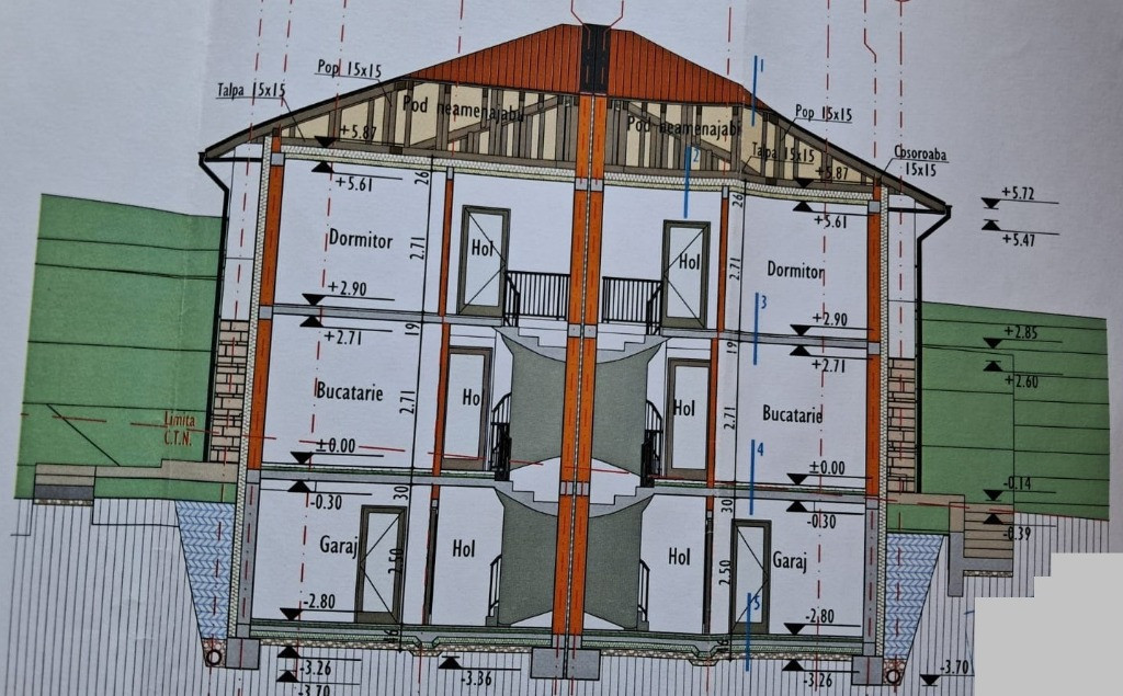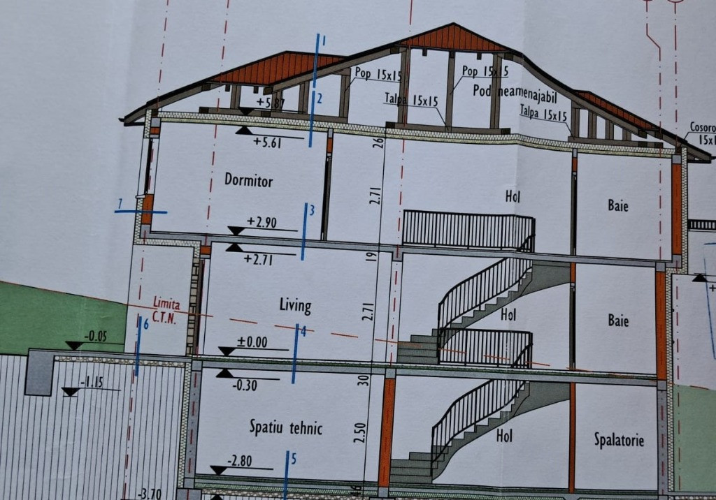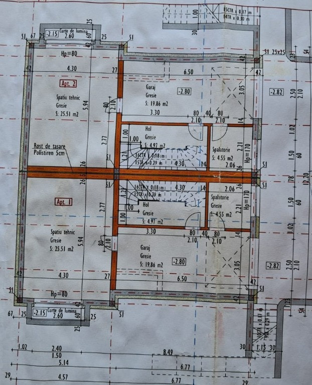 Subsol: garaj 19.86 mp; spalatorie 4.55 mp; spatiu tehnic 25.51mp, casa scarii 4.97 mp;