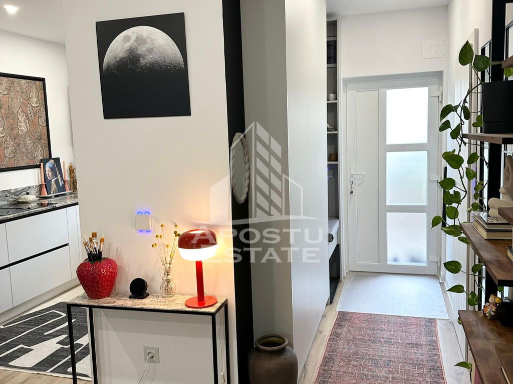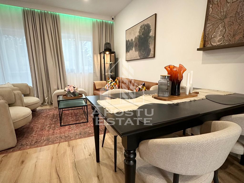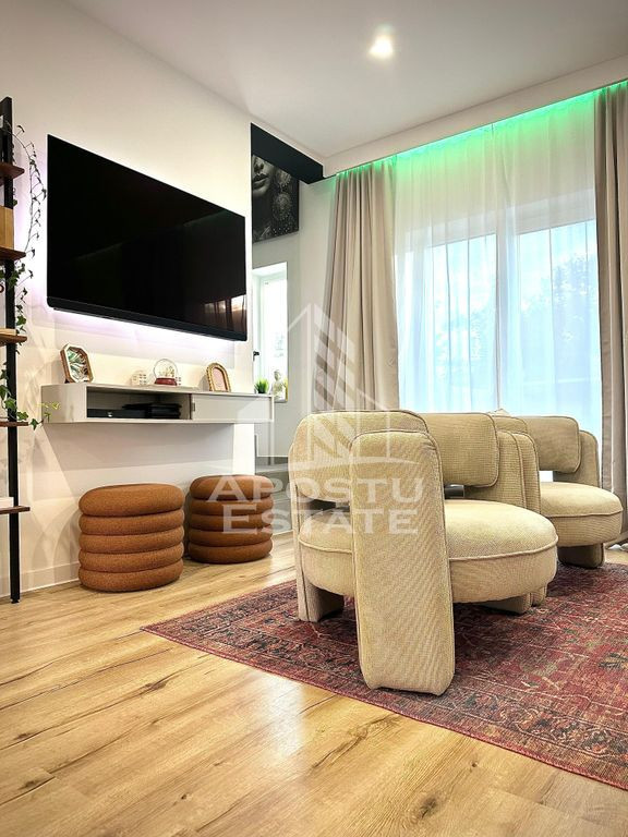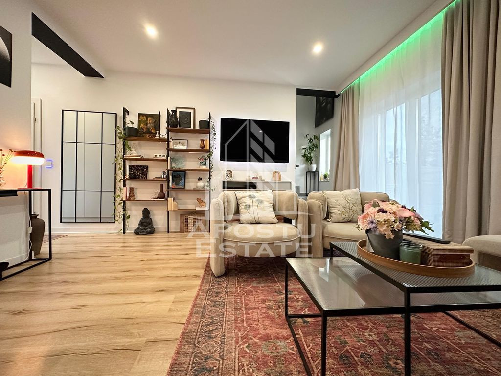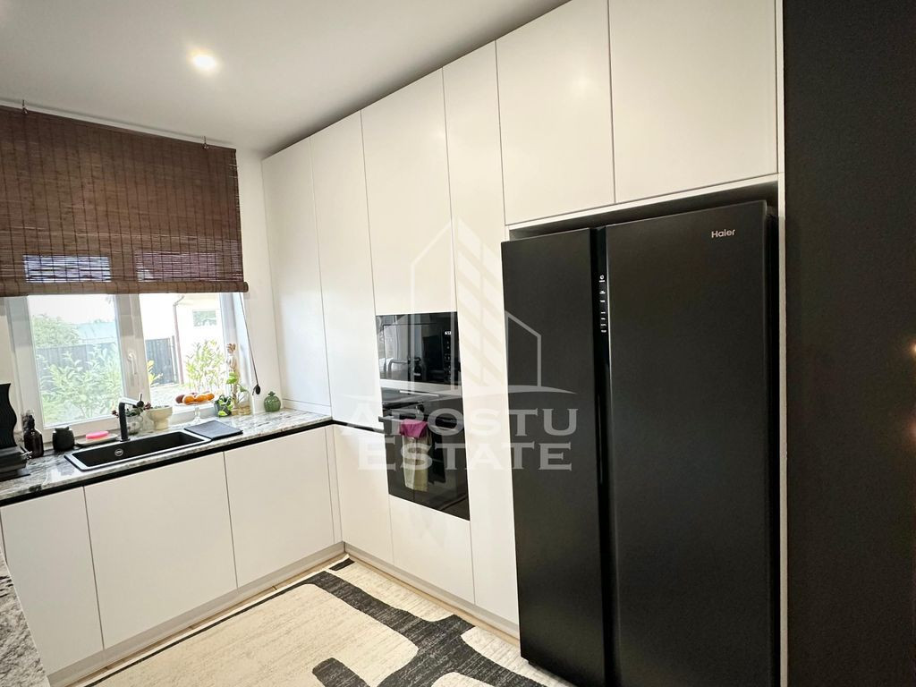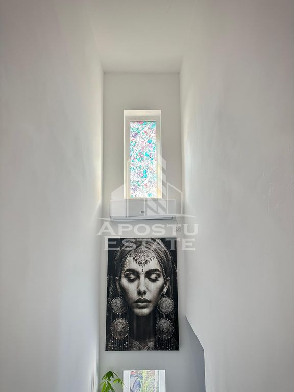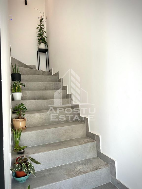 Apostu Estate va propune spre vanzare o jumatate de duplex smart,cu 3 camere,complet mobilat si utilat,in Covaci,la doar 5 min de Dumbrăvița. Duplex P+E finalizat în august 2024, suprafață utilă 74 mp, teren 200 mp, situat în zonă liniștită, cu toate utilitățile (apă, gaz, curent, canalizare, asfalt, fibră optică). Compartimentare: Parter: -hol. - living cu bucătărie open space. -baie. -spatiu de depozitare. Etaj: -2 dormitoare. -1 baie. -pod amenajat si izolat pt depozitare. Finisaje premium: -gresie și faianță Tempini Italia; -încălzire în pardoseală cu termostat Wi-Fi; -mobilier la comandă, blat de granit; -electrocasnice Beko, Haier, Bosch – toate în garanție. Casă Smart – control complet prin aplicație (iluminat, aer condiționat, supraveghere video Eufy, interfon). Curte amenajată: pergolă bioclimatică cu mobilier și iluminat, iaz decorativ, focar, sistem irigații automat, 3 locuri de parcare, gazon și arbori ornamentali. O proprietate amenajata modern,cu atentie la detalii pentru un confort optim. Pozitie excelenta,in zona linistita cu acces facil,strada asfaltata. Va oferim consultanta si solutii financiare prin colaboratorii nostrii! Va asteptam cu drag la o vizionare!