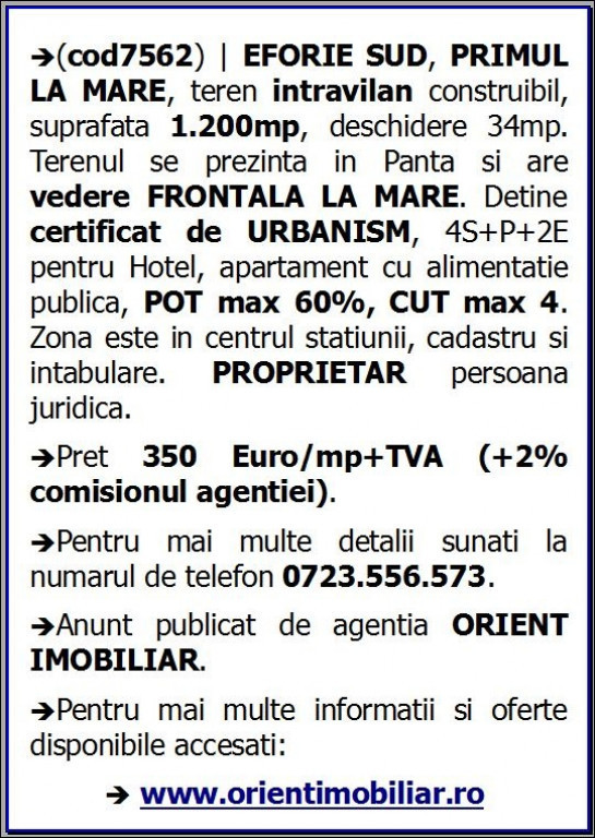 (cod7562) | EFORIE SUD, PRIMUL LA MARE, teren intravilan construibil, suprafata 1.200mp, deschidere 34mp. Terenul se prezinta in Panta si are vedere FRONTALA LA MARE. Detine certificat de URBANISM, 4S+P+2E pentru Hotel, apartament cu alimentatie publica, POT max 60%, CUT max 4. Zona este in centrul statiunii, cadastru si intabulare. PROPRIETAR persoana juridica. Pret 350 Euro/mp+TVA (+2% comisionul agentiei). Pentru mai multe detalii sunati la numarul de telefon 0723.556.573. Anunt publicat de agentia ORIENT IMOBILIAR.