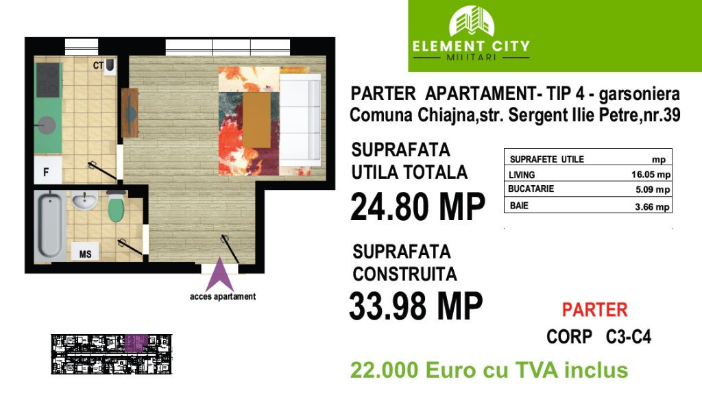 Constructia realizata impecabil, designul modern, finisajele de cea mai buna calitate, apartamentele si garsonierele excelent compartimentate si preturile extrem de accesibile transforma ELEMENT CITY MILITARI in cea mai buna investitie pentru oricine isi doreste un plus de calitate in viata sa.